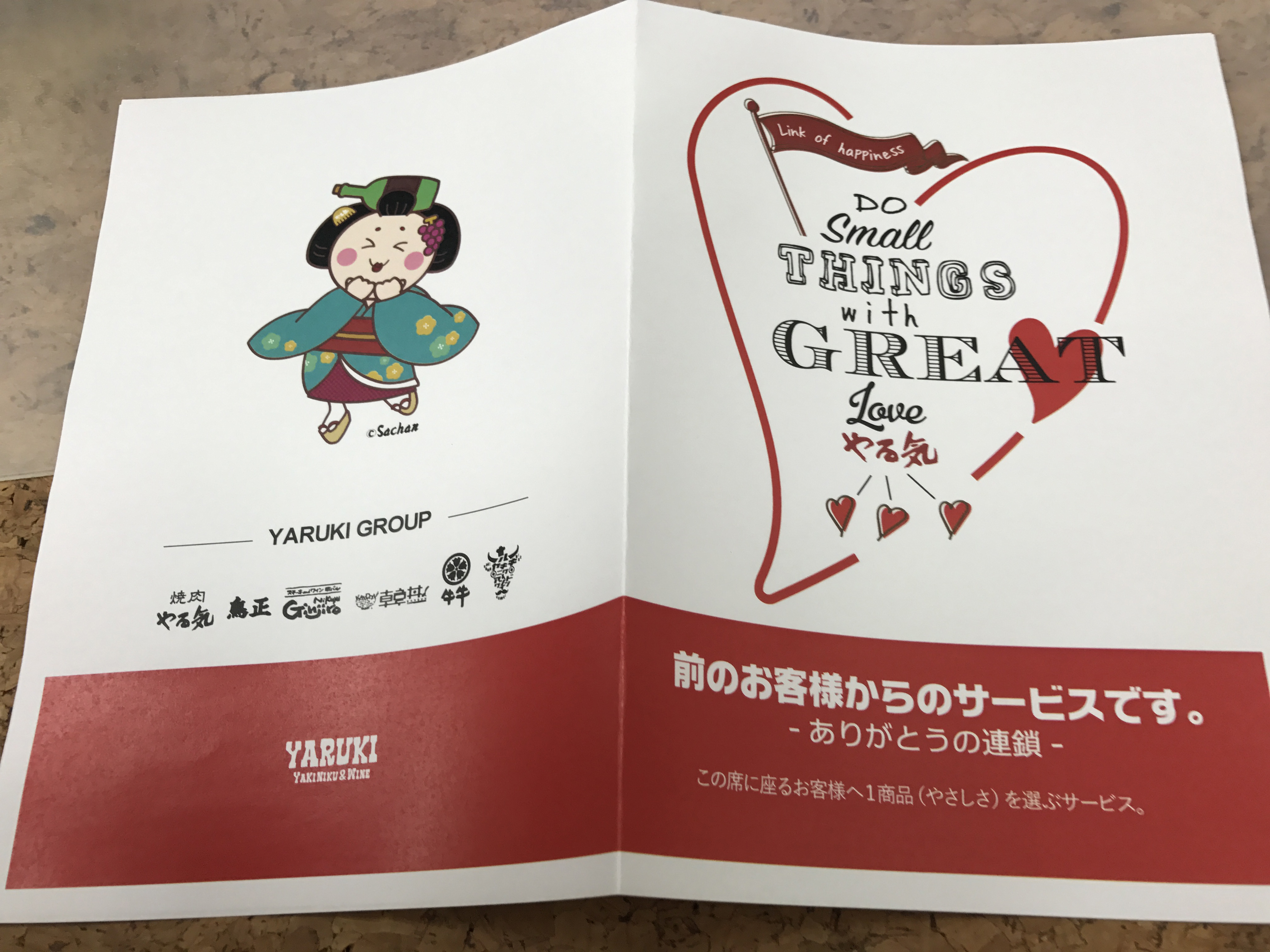 京都を中心に焼肉店などを展開する株式会社やる気(本社:京都市伏見区北端町70番地、代表取締役 大島聖貴)は、11月29日(水) 「いい肉の日」より、店をご利用いただいたお客様が次のお客様のために料理を一品選んで立ち去る、日本初の料理ペイ・フォワード(次の方へ)サービス「前のお客様からです」サービスを「焼肉バルやる気 四条河原町店」で開始いたします。