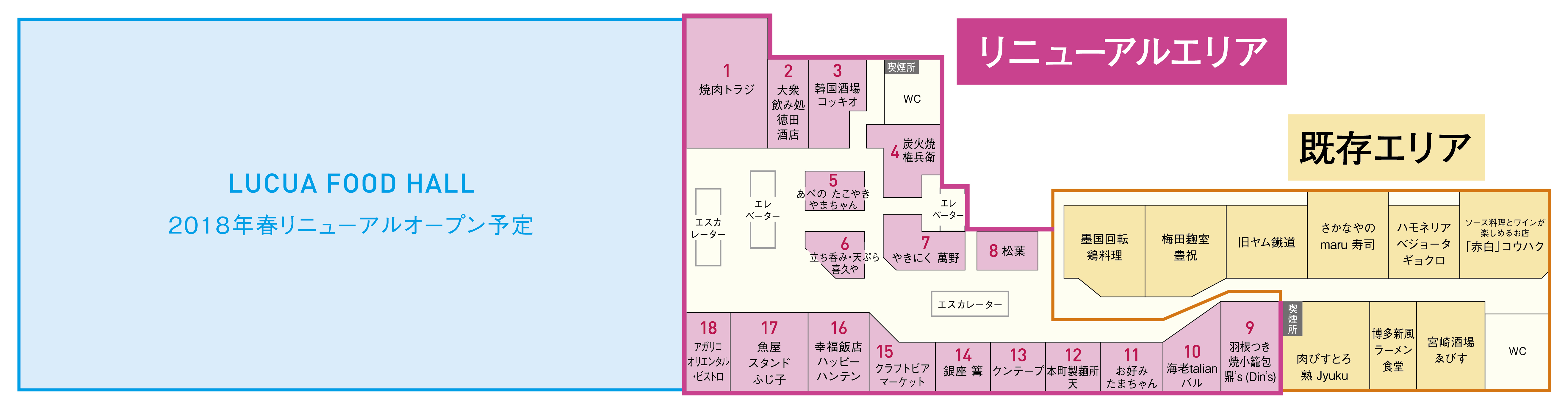 第2期のリニューアルは2018年春のオープンを予定しており、「阪急オアシス」の新業態を核テナントに、食料品の買い物だけではなく、販売している食材を使ったメニューがその場で食べられるクイックイートインや、ゆっくりお食事をお楽しみいただけるレストランなどがボーダレスに融合、 “食”に関する様々な体験、“食”の新しい価値を提供するエリア「LUCUA FOOD HALL」(面積:約860坪)として大きく生まれ変わります。