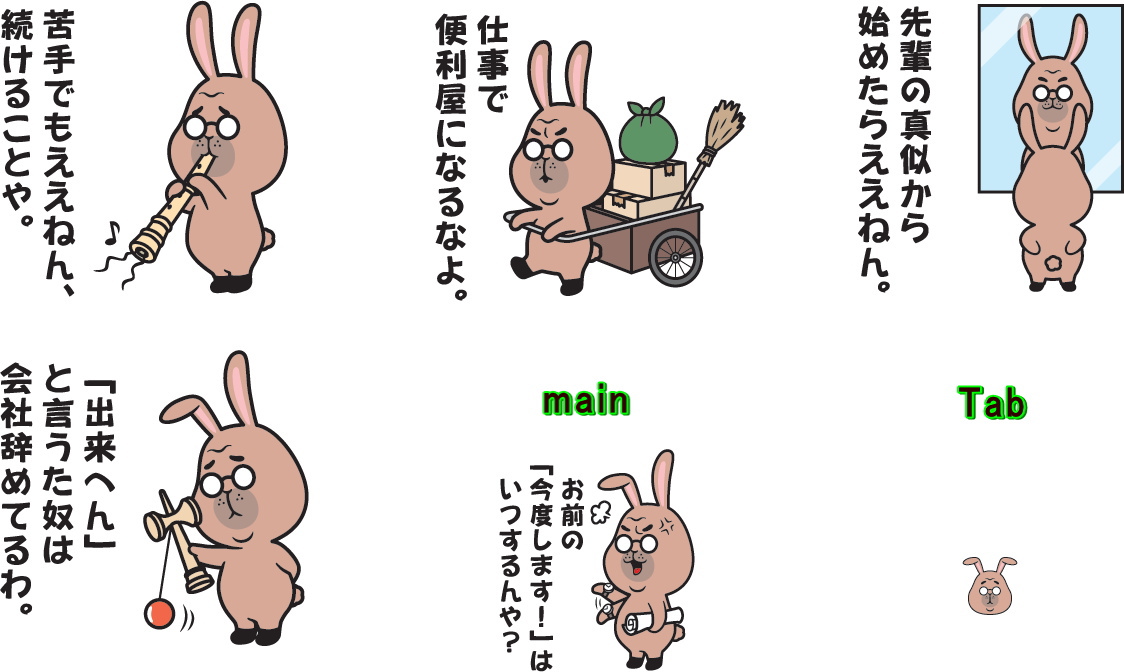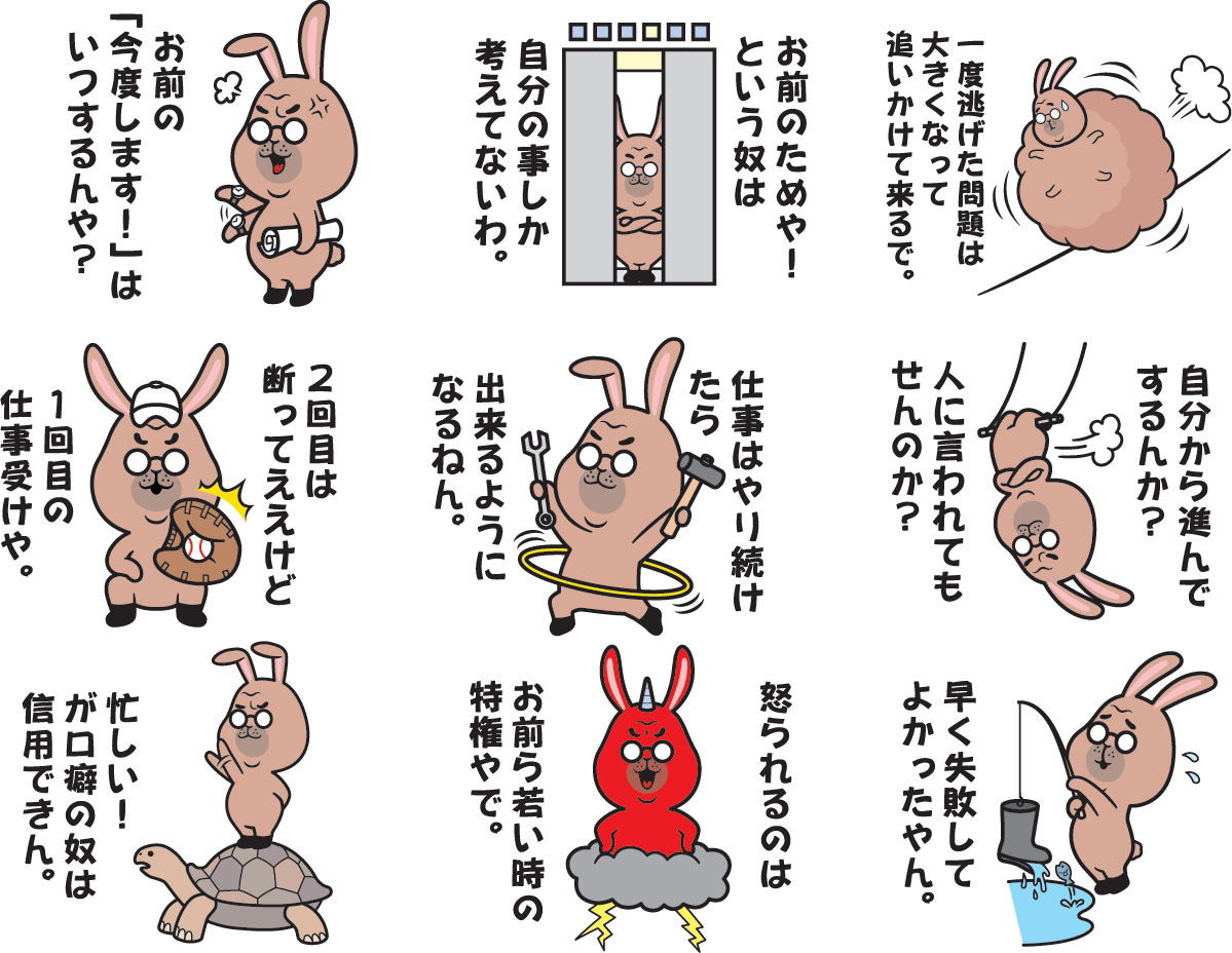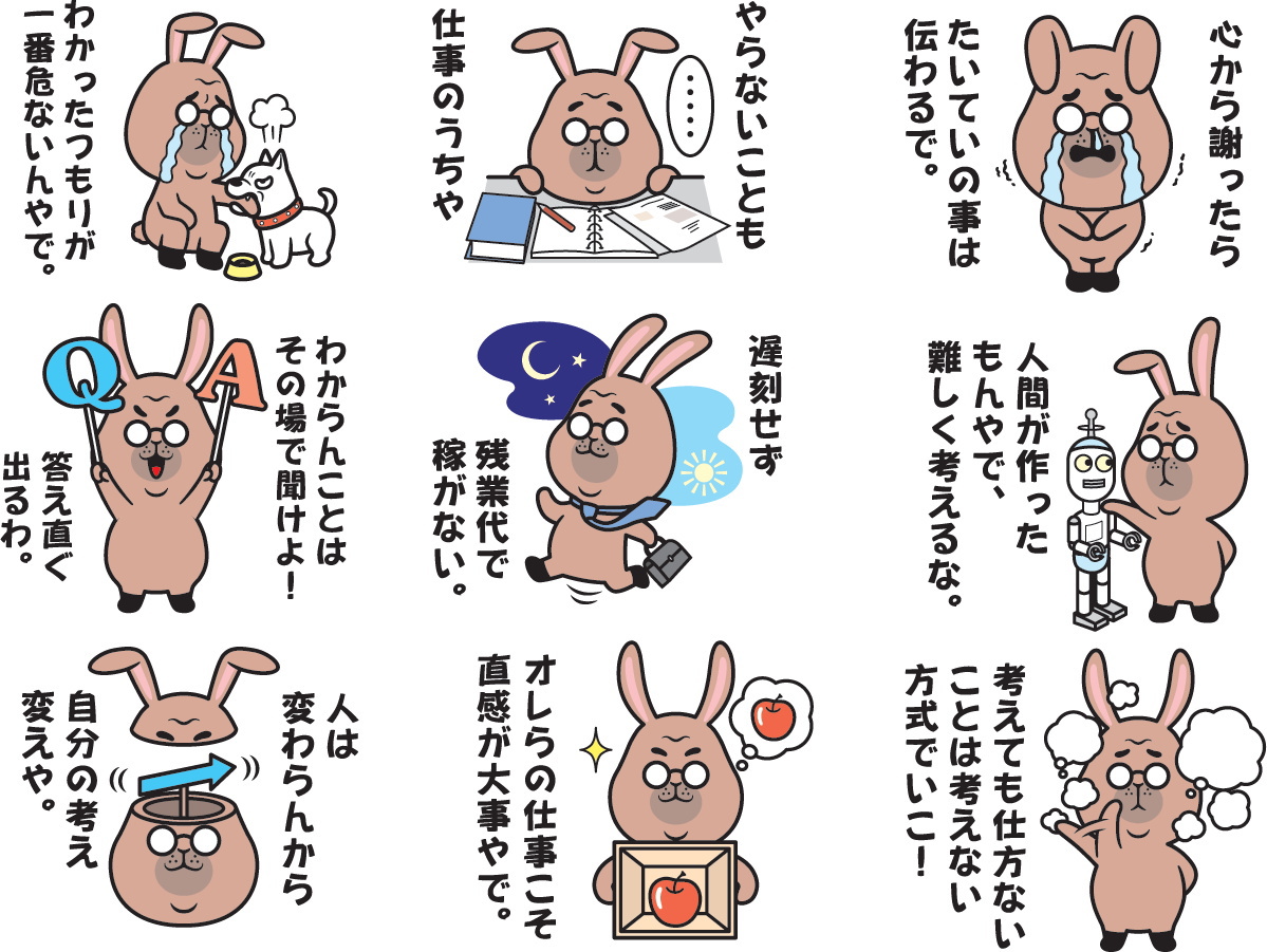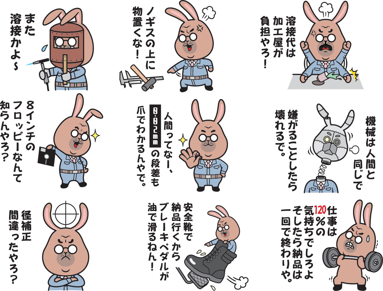 町工場ひしめく東大阪、八尾で生まれ育ったうさぎ工場長が仕事から学んだ人生のつぶやき、工場でのつぶやき、ビジネスマンの友達同士でコミュニケーションをとるためのラインスタンプです。厳しい言葉もありますが、先輩・後輩で楽しくやり取り出来ます。