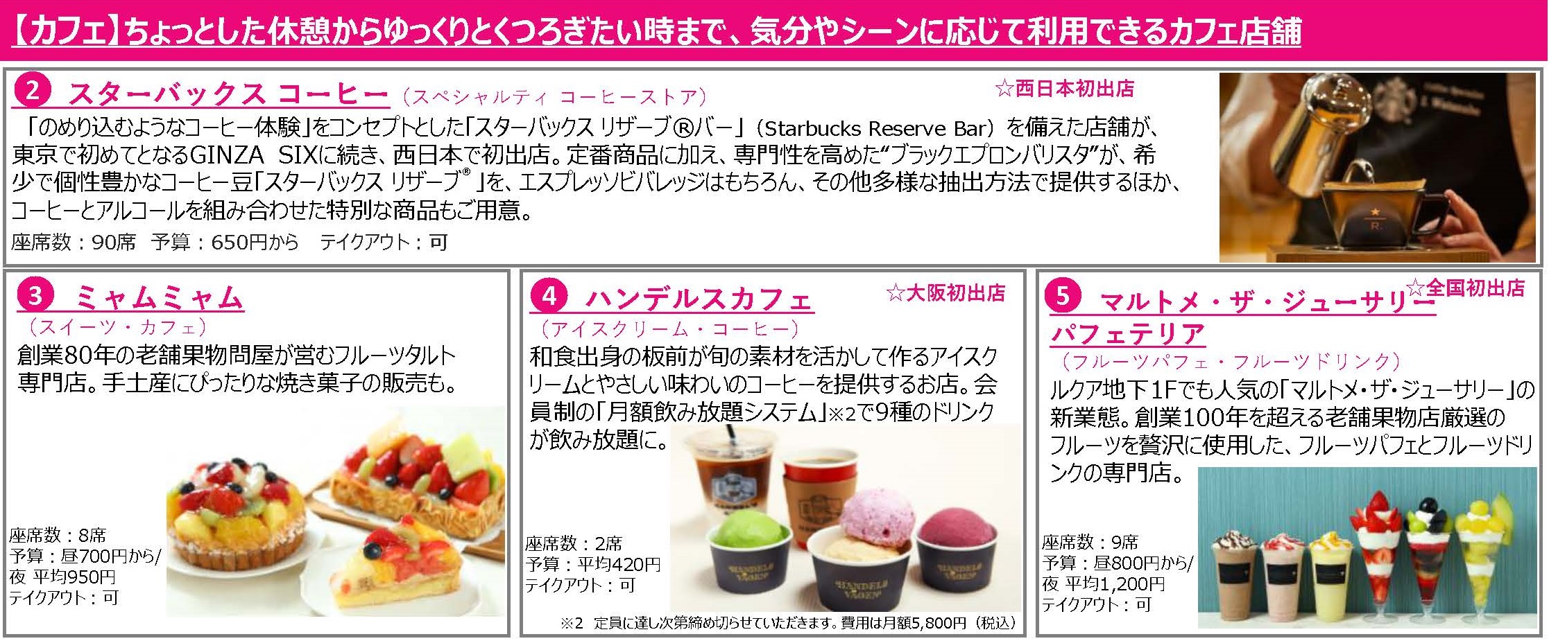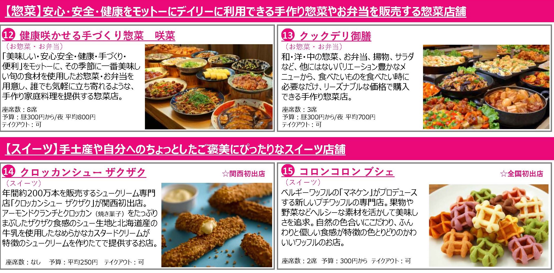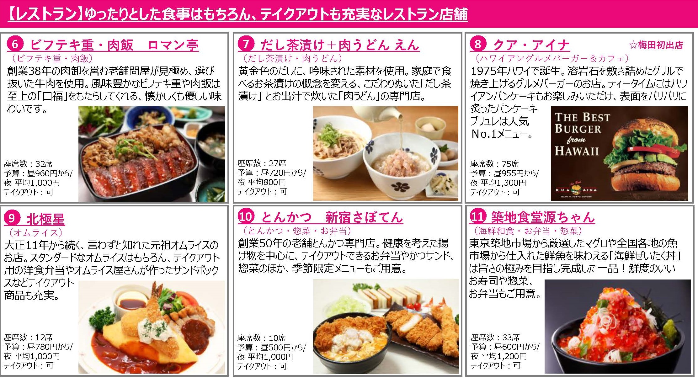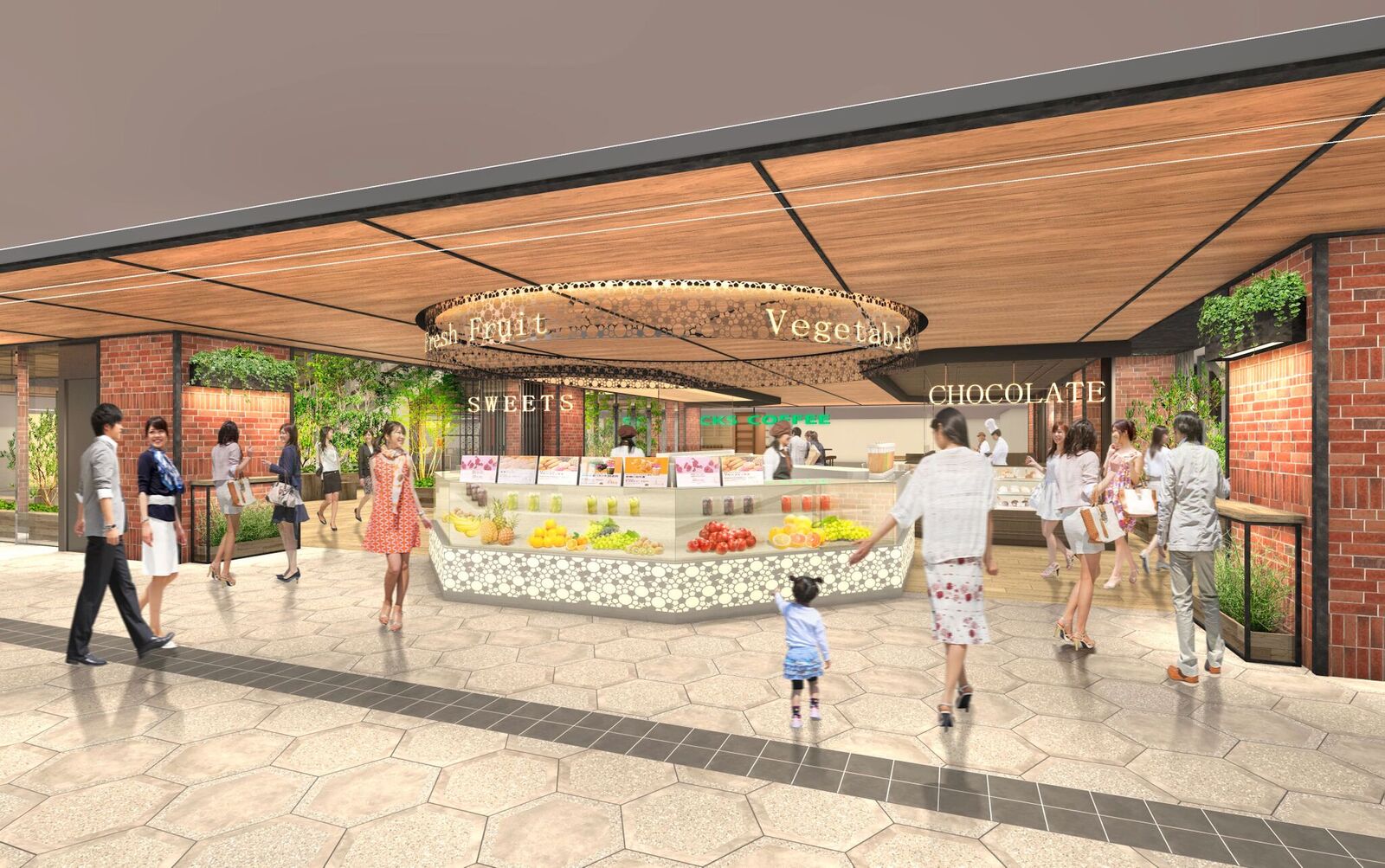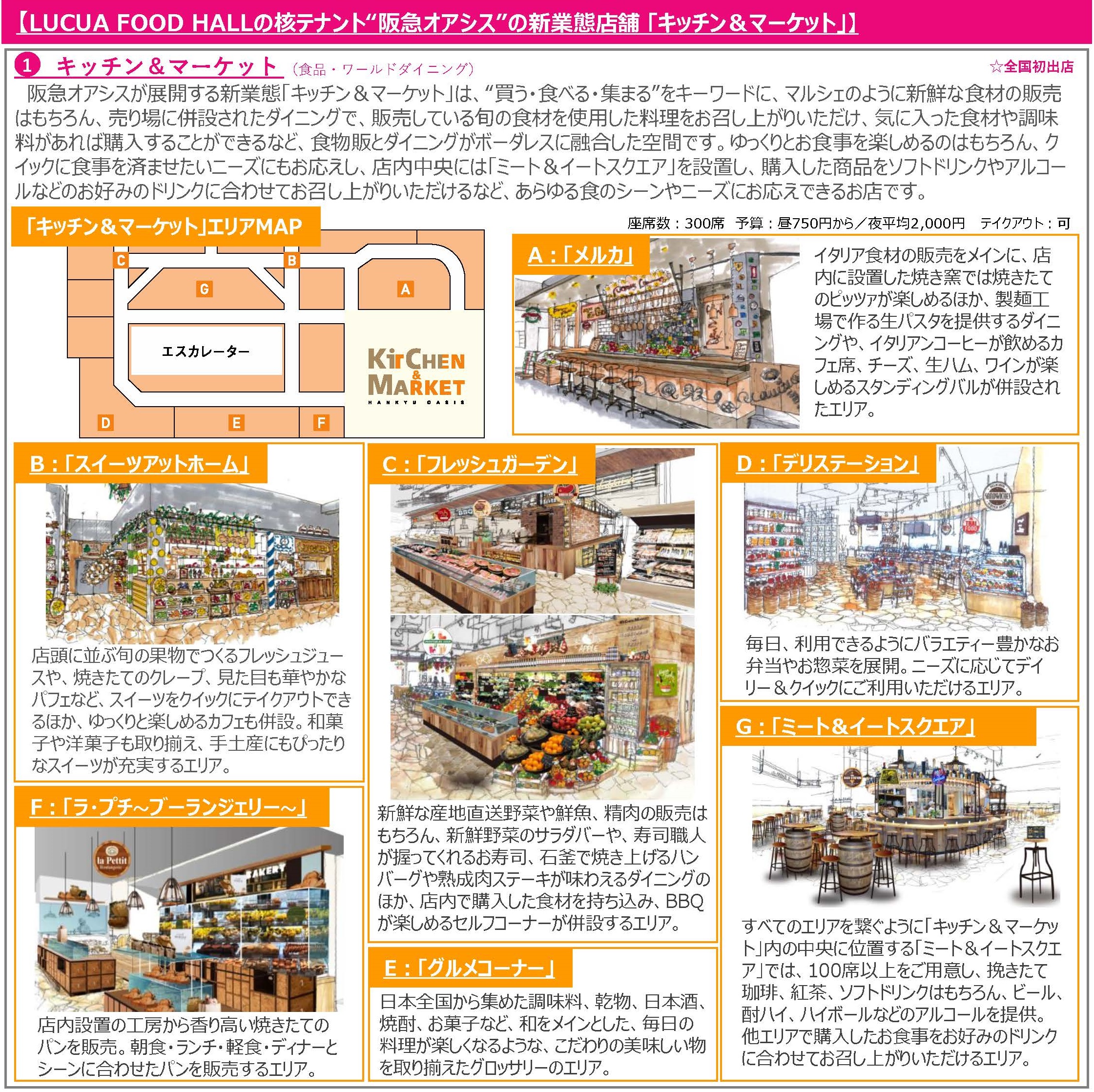 「LUCUA FOOD HALL」の核テナントである阪急オアシスの新業態「キッチン&マーケット」では、マルシェのように新鮮な食材や、惣菜がお買い求めいただけるのはもちろん、販売している食材を使用した料理が食べられるコーナーや、購入した商品がその場で食べられるコーナーなど、300席以上の飲食スペースを設置いたします。その他、利用シーンに応じてご使用いただけるカフェ店舗やレストラン店舗、手土産にも最適なスイーツ店舗など合計15店舗が出店いたします。