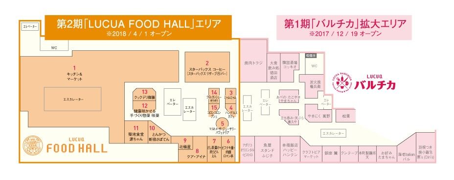 2017年12月19日(火)にオープンした第1期の「バルチカ」エリア拡大オープンに続き、第2期のリニューアルでは、ヨーロッパで発祥し、アメリカでも人気のフードスポットとなっている「フードホール」をベースとした、新しい食のエリア「LUCUA FOOD HALL」 を2018年4月1日(日)にグランドオープンいたします。