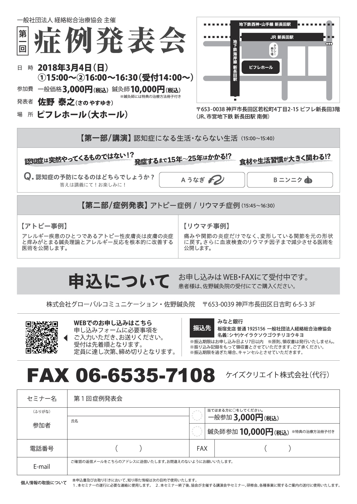 この度、一般社団法人 経絡総合治療協会(代表:佐野泰之)は、2018年3月4日(日)に神戸・ピフレホール(住所:兵庫県神戸市長田区若松町4-2-15 ピブレ新長田3階)にて認知症にならないための講演を交えた「第一回 症例発表会」を開催いたします。