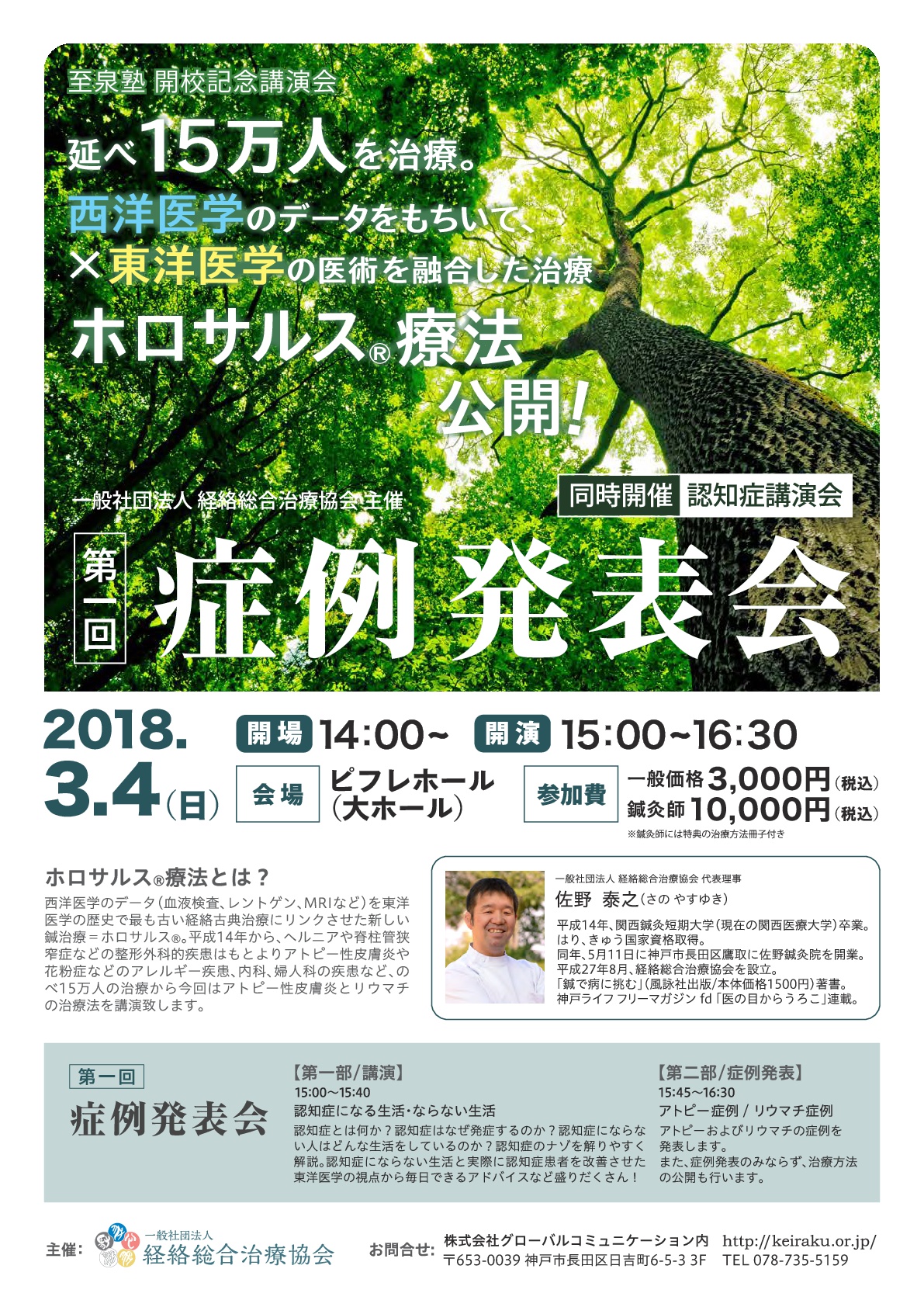 延べ約15万人の患者様を診てきた佐野泰之が掲げる鍼治療法「ホロサルス療法®」は、ヘルニアなどの整形外科的疾患、アトピー性皮膚炎や花粉症などのアレルギー疾患、内科、婦人科の治療に効果が高いと言われています。一人でも多くの人に「ホロサルス療法®」を知っていただくために、4月9日の「鍼灸の日」を前に講演会を交えたイベントを開催いたします。