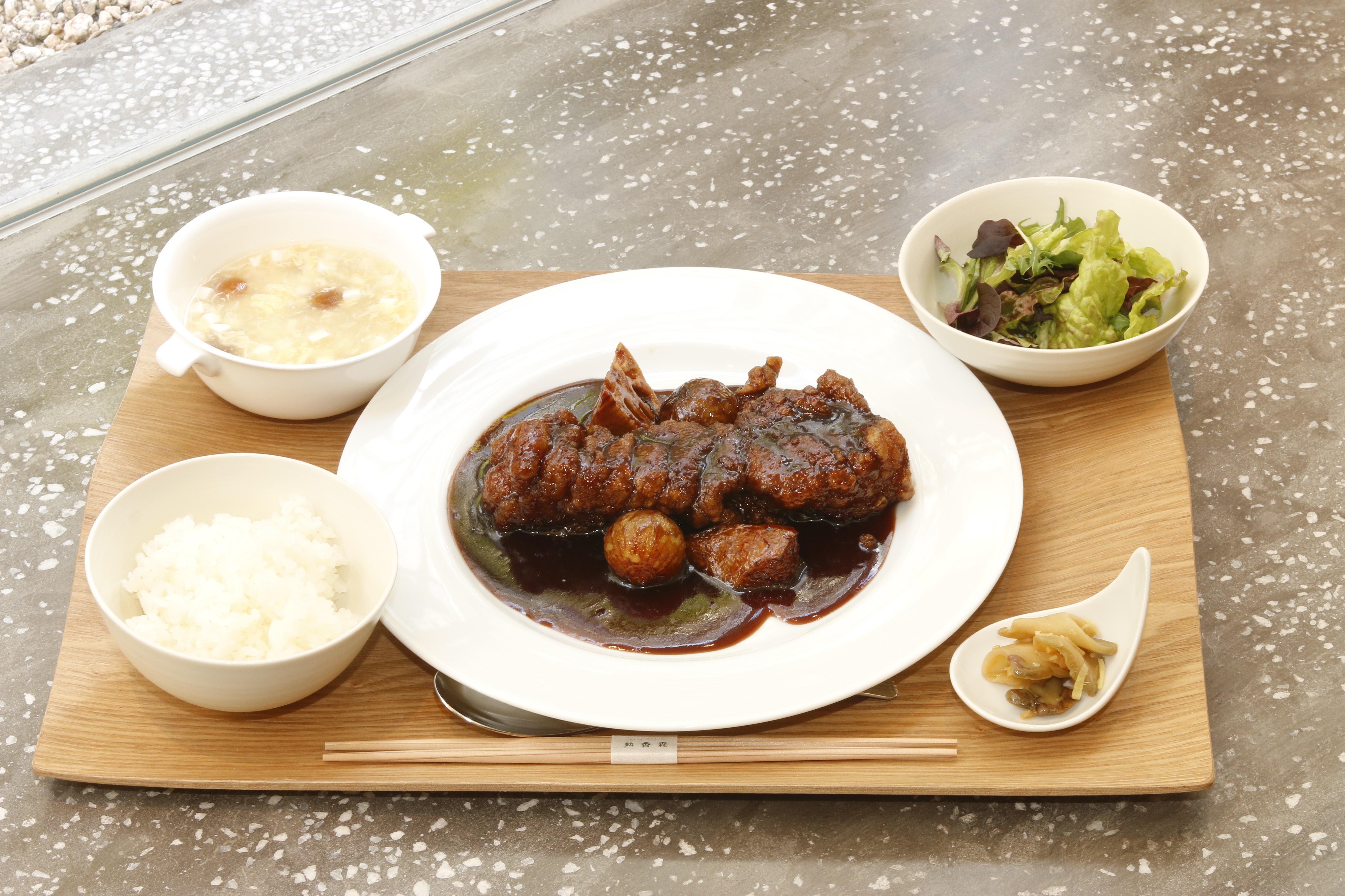 脂の甘味がたっぷりと詰まった豚肉を味わえる「特製黒酢と葡萄の酢豚ランチ」(限定10食)は、香りが良く、一噛みで甘味がある上質な脂が溢れ出す新鮮な豚のバラ肉を、酸味の穏やかな特製葡萄ソースで食べていただきます。通常提供する2~3人分をランチでは1人分とするためボリュームがあります。ナイフとフォークで切り分けると、しっかりと味付けがされた豚肉と葡萄の香りが食欲を誘う贅沢な一品です。