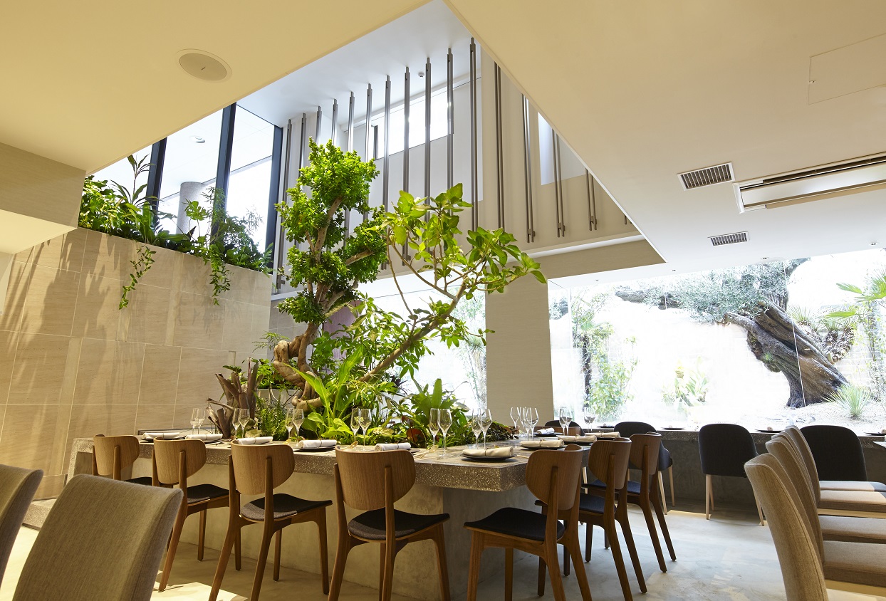 1階にテーブル・カウンター席、2階に8席の隠れバーと、8席の個室があり、推定樹齢200年のオリーブなど、緑が美しい外庭を望みながら、落ち着きのあるモダンな空間で食事ができます。夜にはライトアップ演出が幻想的で、非日常的な雰囲気を生み出します。