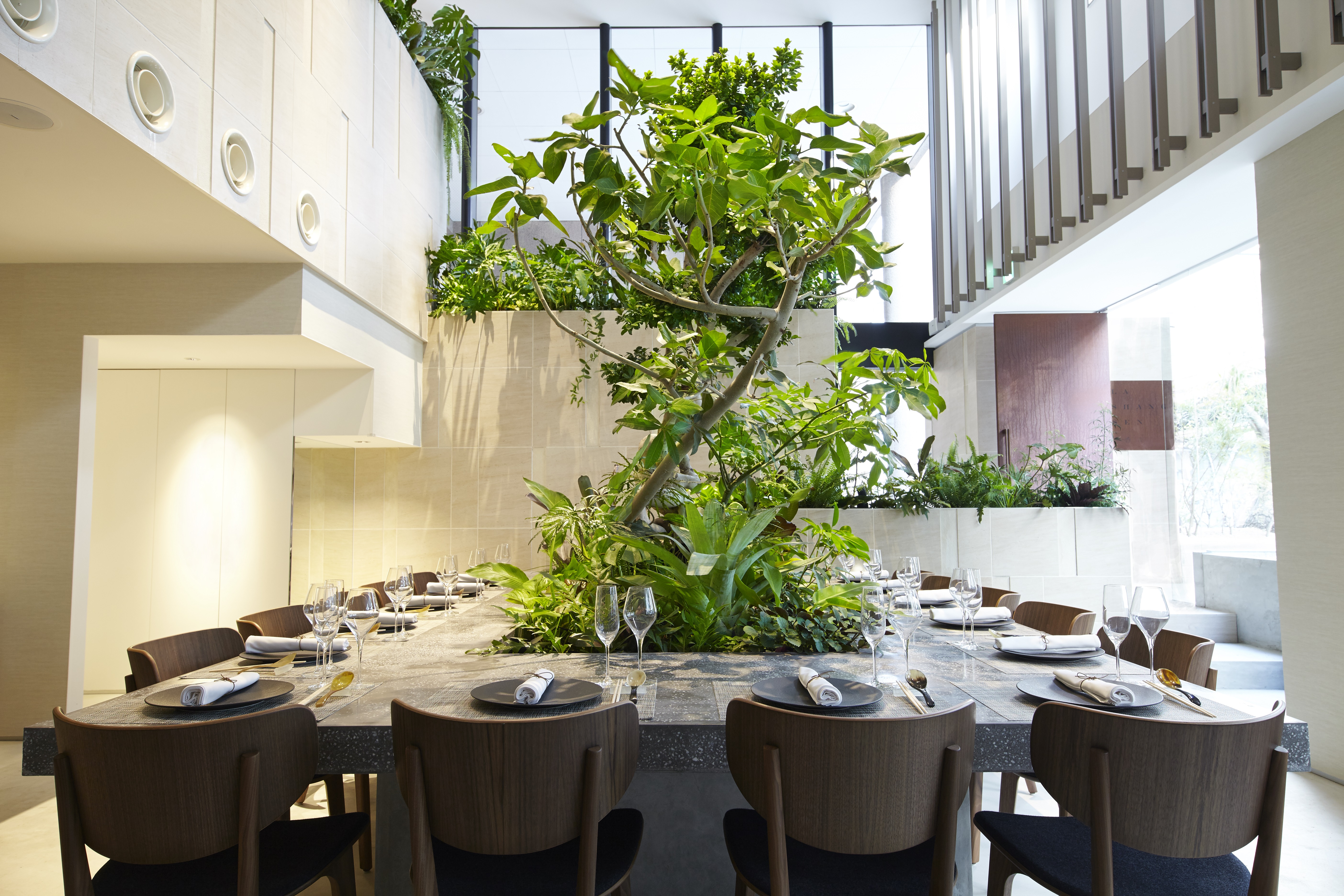 天井高5mの開放的空間に若木が凛と立ち上がる西畠清順氏監修の「深緑のオアシス」で味わう本格中国料理を、より多くのお客様に知っていただくためランチを始めます。昨年8月のオープン以来、コース仕立てで提供するディナーは記念日のお祝いや会社の接待として多くの方にご利用いただき、大変ご好評をいただいています。オープンから約半年が経ち、店側の準備が整ったことから近隣オフィスにお務めの会社員の方々を中心に幅広いお客様に向けてランチメニューを提供することにいたしました。