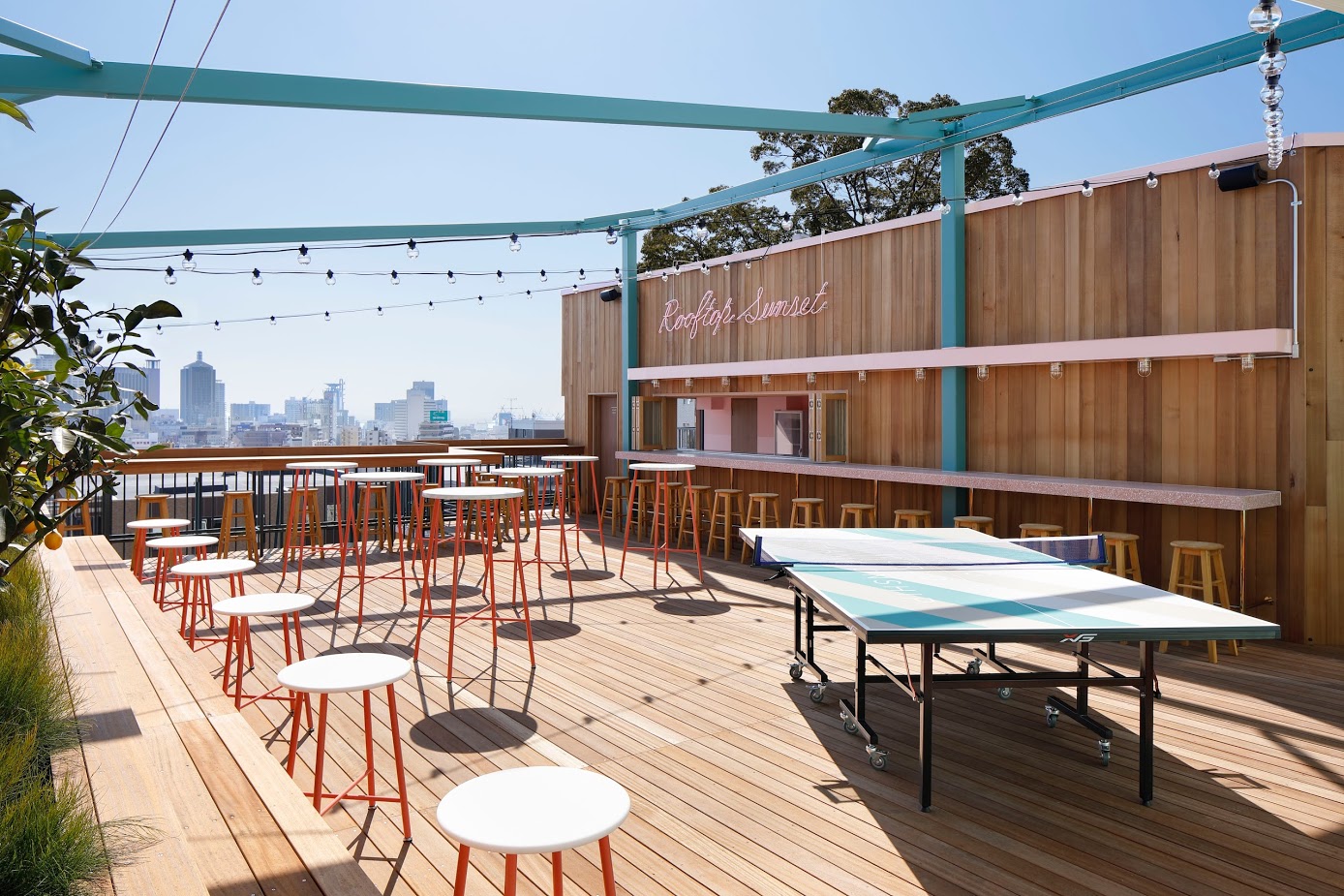 最上階に位置する開放的なルーフトップ。BARを設置し、神戸の景色を一望できる。昼と夜とでガラリと表情を変え、木製デッキとイルミネーションライトがリゾート感を演出。