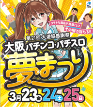 3月23日(金)~3月25日(日)の3日間、大阪府下のパチンコホールで「大阪パチンコ・パチスロ夢まつり」を開催します。魅力ある賞品を用意し、パチンコ・パチスロファンの皆様にお楽しみいただきます。