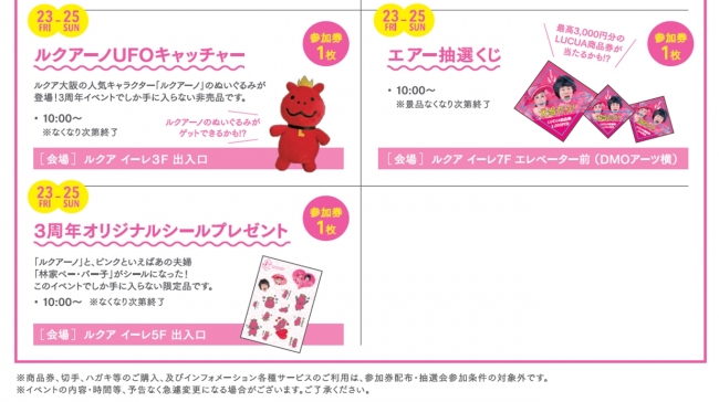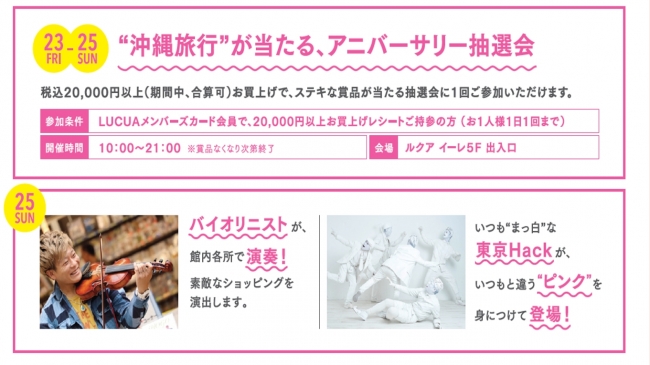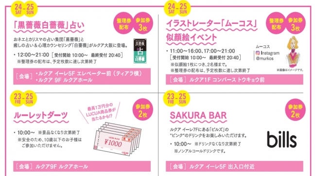 また期間中、お買い物・お食事いただいたLUCUAメンバーズカード会員様には、館内にて開催のイベントに参加できる「参加券」をプレゼント! “ピンク”のアイテムを身につけてお越しいただいた方限定で、参加券の枚数に応じて様々なイベントをお楽しみいただけます。