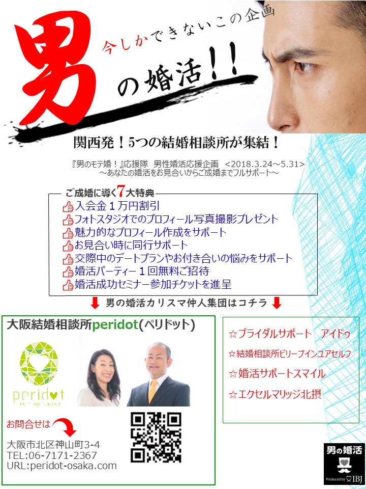 仲人型結婚相談所である大阪結婚相談所peridot(ペリドット、所在地:大阪府大阪市、代表:村上 利治)は、2018年3月24日(土)より男性を対象とした婚活サービスのキャンペーン「今しかできないこの企画 男の婚活!!」を開始いたしました。本キャンペーンは婚活市場に不足する男性会員を増やし、成婚数を増やす取り組みの一環として、男性の婚活を応援するもので、株式会社IBJ(証券コード:6071)バックアップの元、70チーム(約160社)が一丸となって行う少子高齢化対策・婚活応援のひとつです。