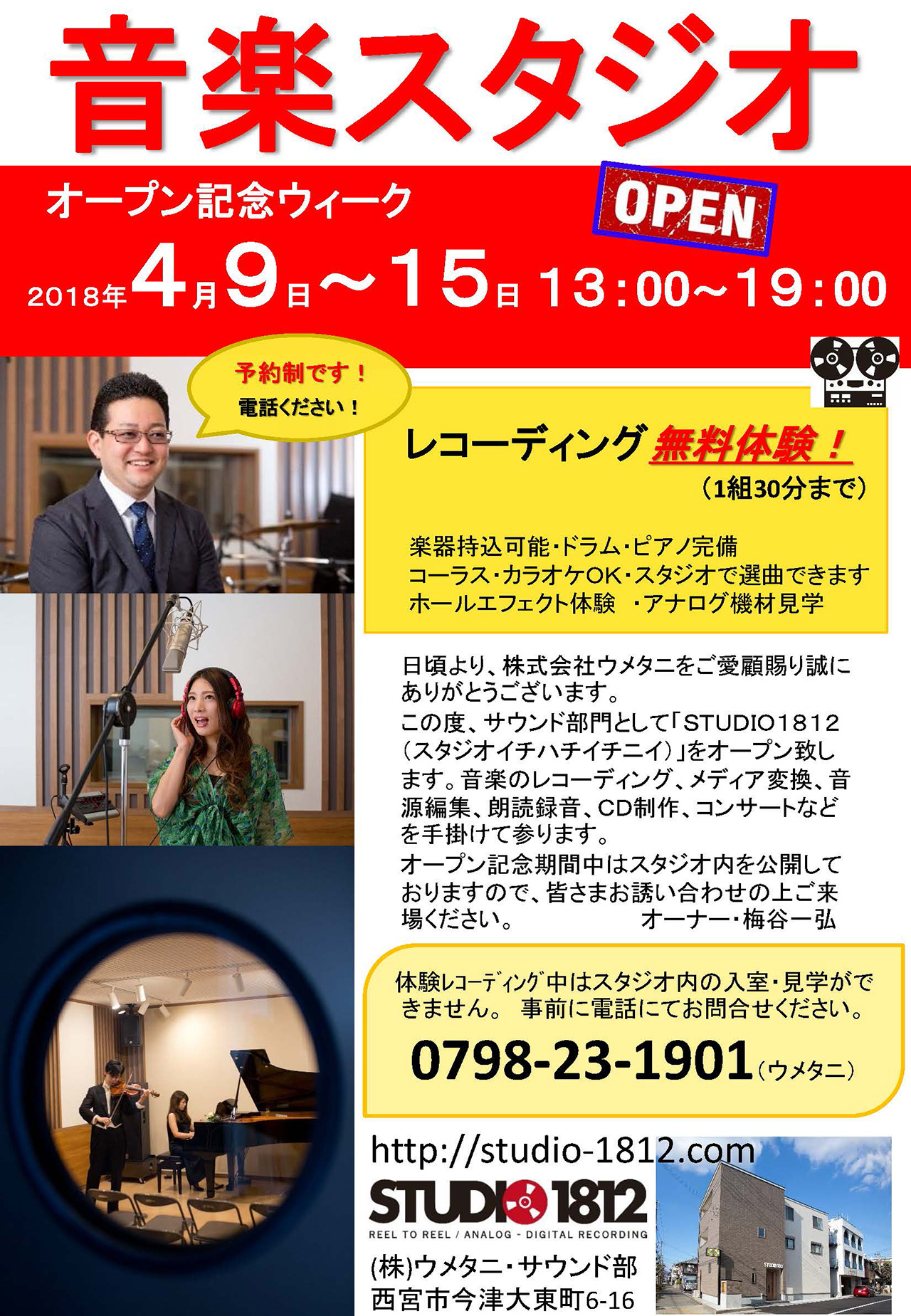 畳・内装工事を手掛ける株式会社ウメタニ(兵庫県西宮市今津大東町、代表取締役:梅谷一弘)は、酒蔵通り沿いの同社敷地内に4月8日、レコーディングスタジオ「STUDIO 1812(スタジオイチハチイチニ)」をオープンします。
