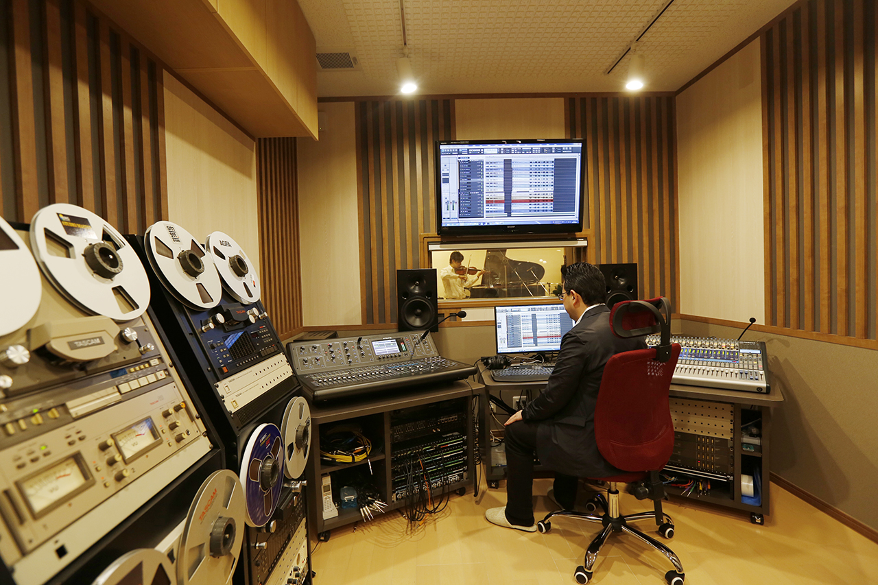 BスタジオはAホールで演奏している音を録音・即時編集可能なほか、録音ブースとしても利用可能です。現在主流のデジタル録音だけでなく、複数台のオープンリールを駆使したアナログ録音設備も備えています。