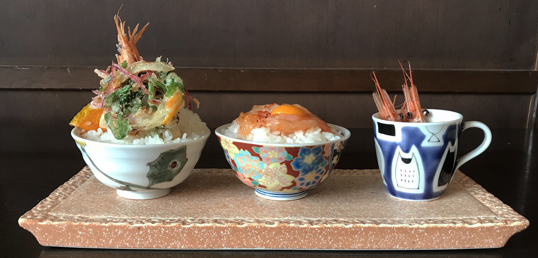 ・九谷焼姫椀の甘海老天丼と生甘海老の和風ユッケ丼
