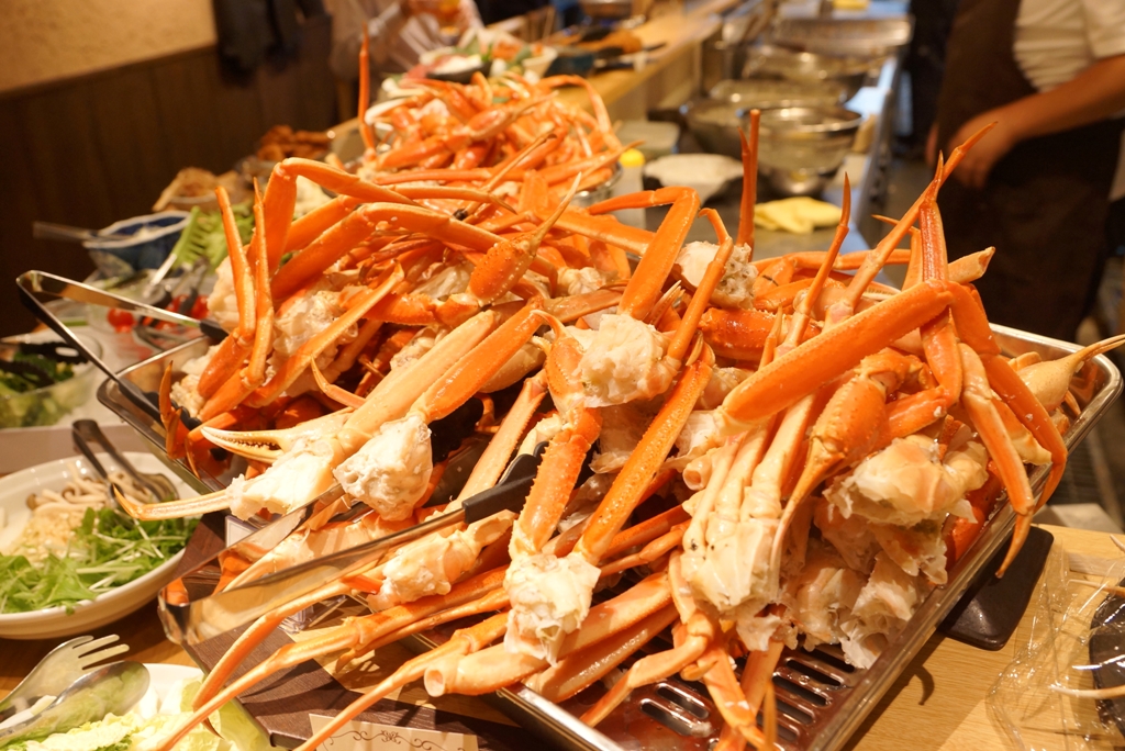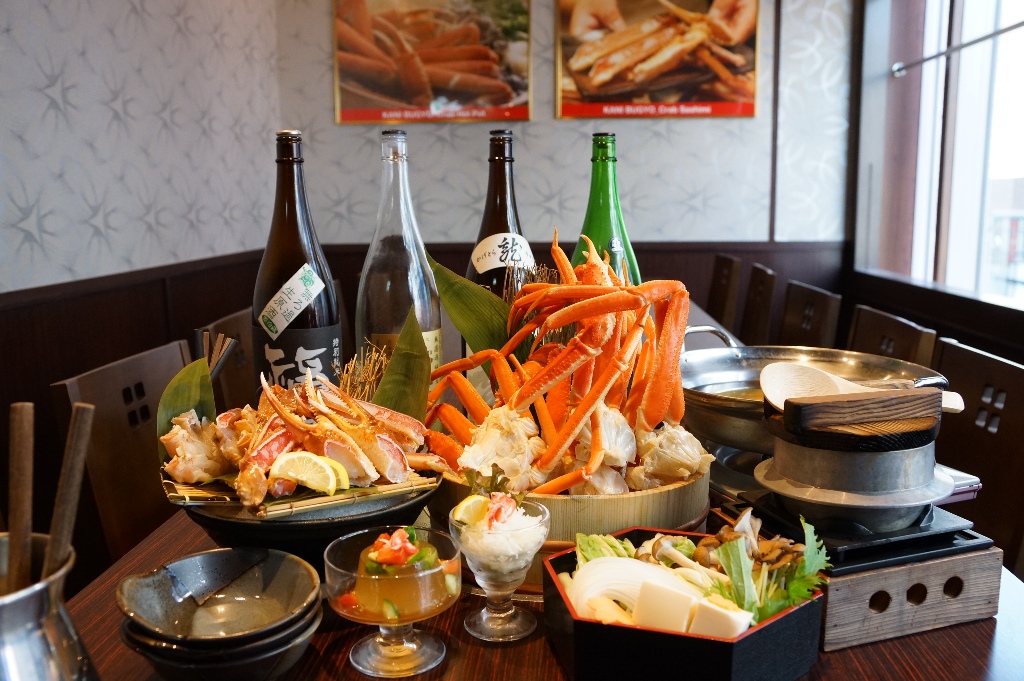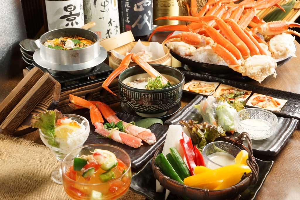 カニすき鍋はもちろんのこと、カニ酢で食べる茹でガニやご注文ごとに揚げるカニの天ぷら、贅沢極みの焼きガニに新鮮カニ刺し(生ズワイガニは別料金)、ブッフェコーナーには季節によってカニのアヒージョやカニの生春巻きなどの創作料理や、またカニ身たっぷりの釜めしやカニ身のお寿司などカニ尽くし。おすすめはカニすき鍋の締めにたっぷりカニ身をほぐして入れたカニ雑炊です。ご来店されたお客さまは、しゃぶりつくすことに夢中でしゃべるヒマがないともっぱらの噂です。