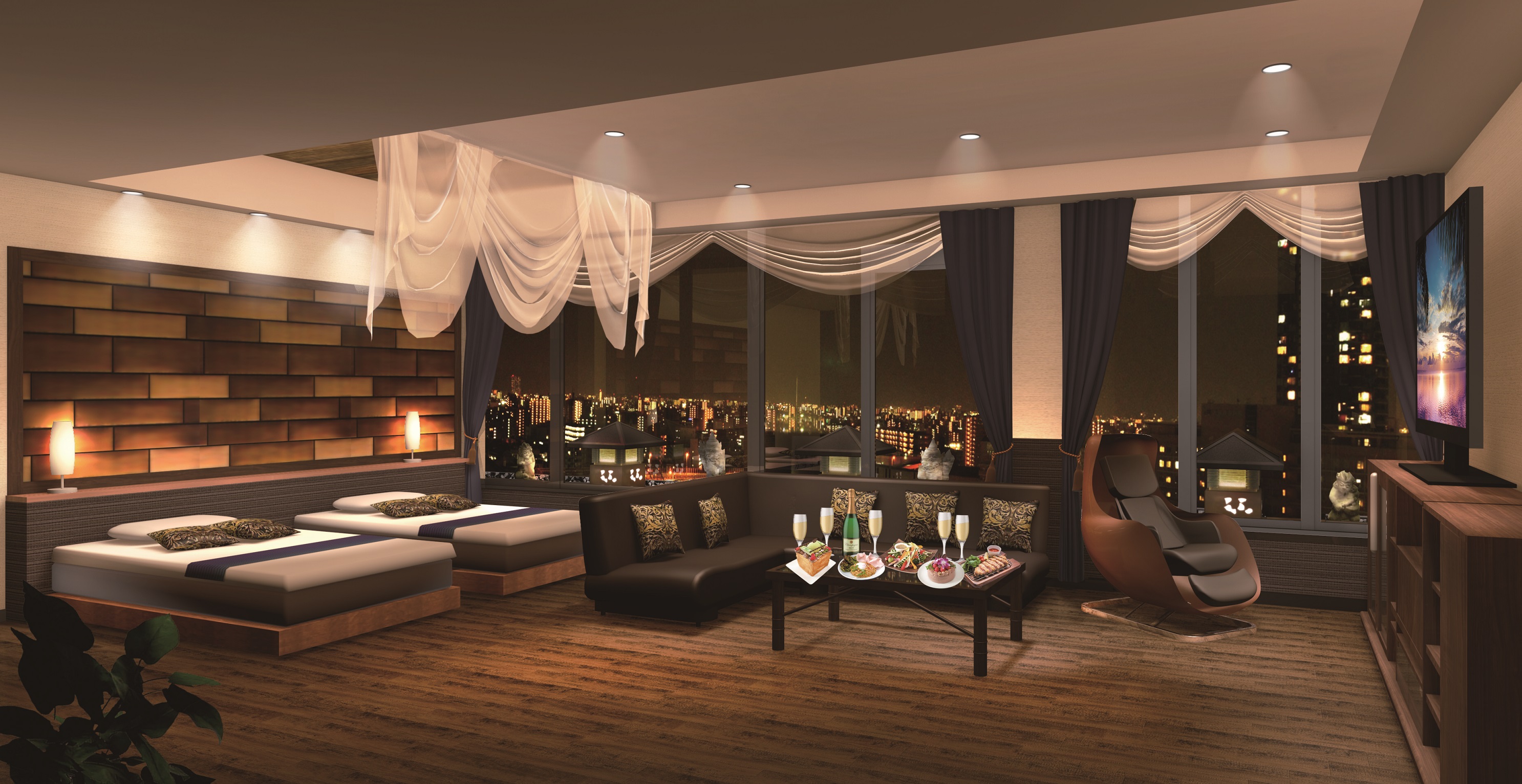 5月24日(木)に新設する最上階13階のスカイフロア客室は「デラックスパーティー」「デラックスファミリー」「デラックスシアターツイン」「ロイヤルスイートリビング」の全部で4タイプ。「デラックスパーティー」・「デラックスファミリー」の客室からは、通天閣とあべのハルカスが間近で見える天王寺エリアならではの客室となっております。