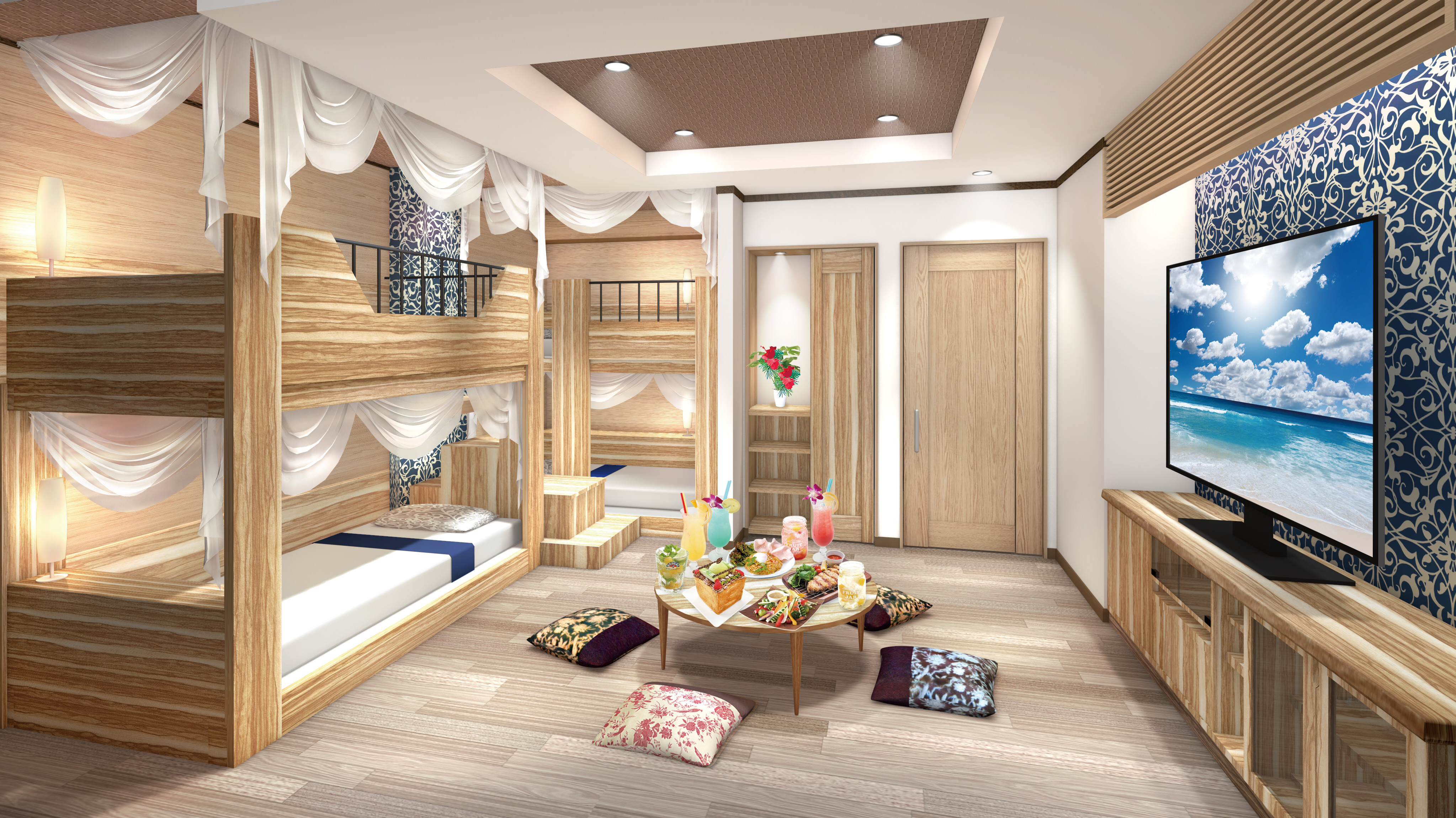 「デラックスパーティー」「デラックスファミリー」には、個々のベッドに、24インチTVやヘッドフォン、携帯充電器、スマホ→TV・HDMI出力、目隠し用のカーテンなど、同社の進化形カプセルホテルを思わせるような充実した設備を設け、女子会やグループで利用するお客様でも、就寝時のプライベート感を大事にした作りにしております。