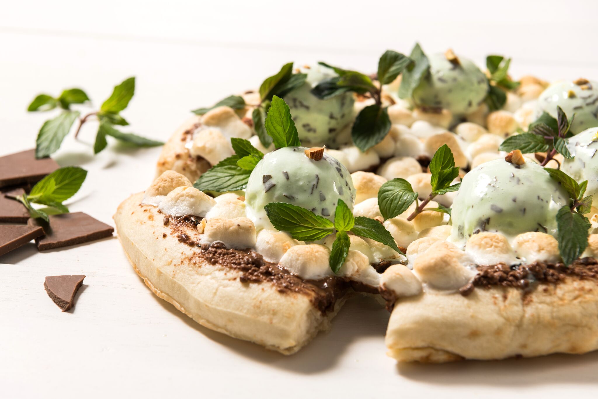 ピザ生地の上にミルクチョコレートと刻んだフレッシュミント、マシュマロを乗せて焼き上げました。暑い季節にもさっぱり食べられる冷たいミントアイスとカリッとした食感のローストアーモンドも相性抜群です。カップアイス第3弾「マックス ブレナー ミントチョコレートチャンクアイスクリーム」 をイメージしました。