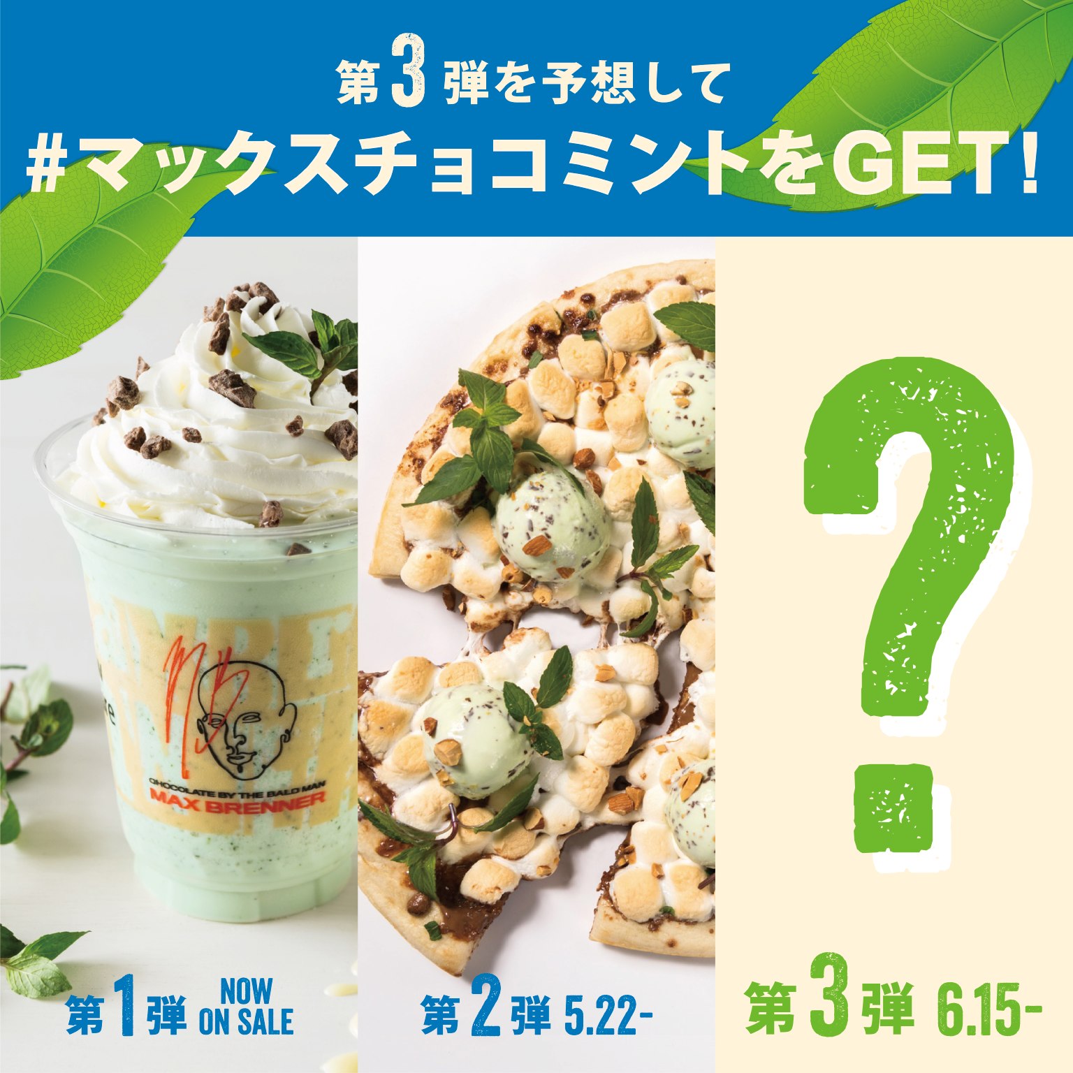 2018年8月末まで、「MAX BRENNER チョコミントシリーズ」全3弾の第1弾「ホワイトチョコミントシェイク」、第2弾「フレッシュミントチョコレートピザ」(5月22日(火)〜)を販売。6月15日(金)から販売の第3弾のチョコミントスイーツを3つの中から予想し、正解すると、抽選で第3弾スイーツの無料クーポンを20名様にプレゼント!!