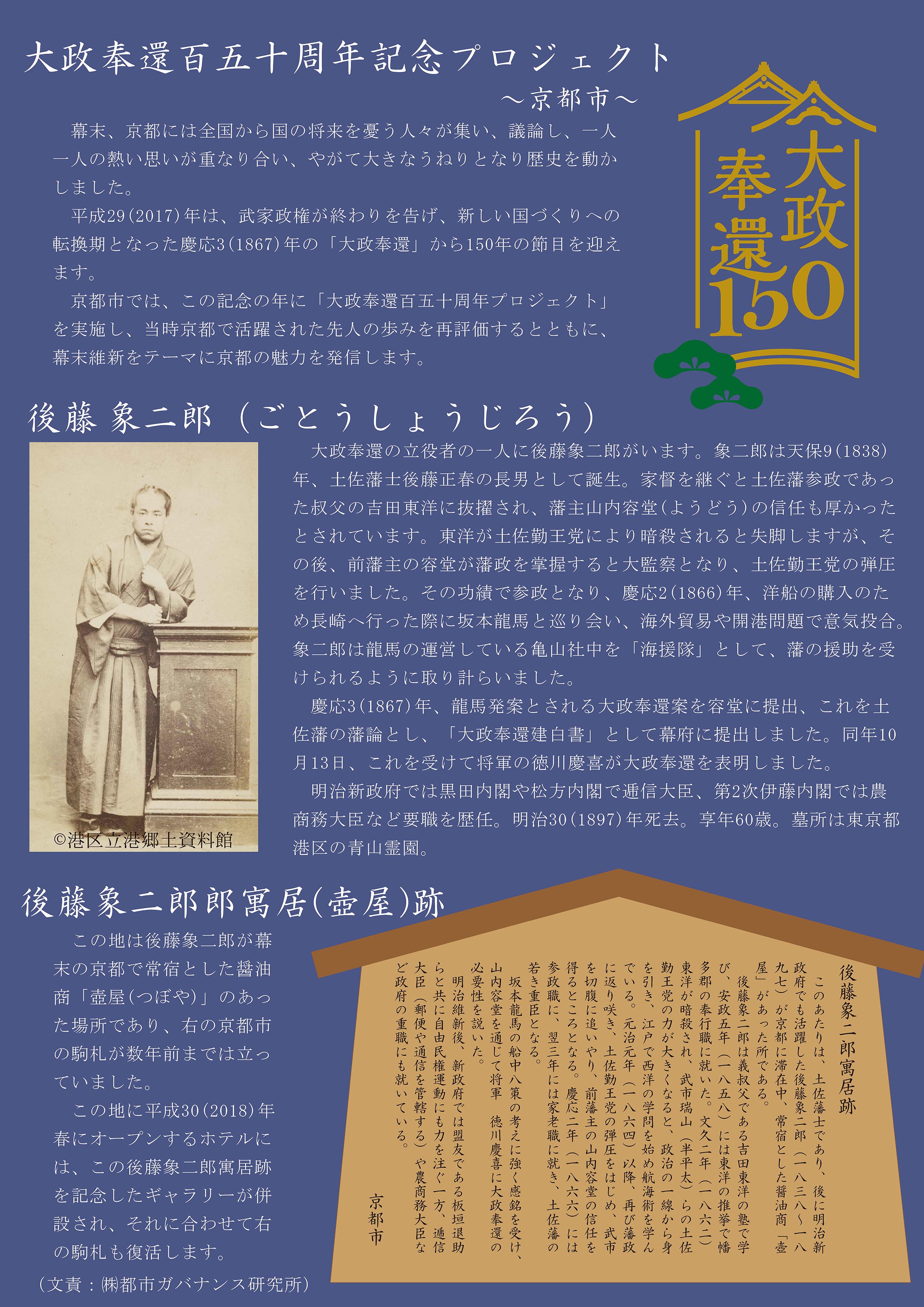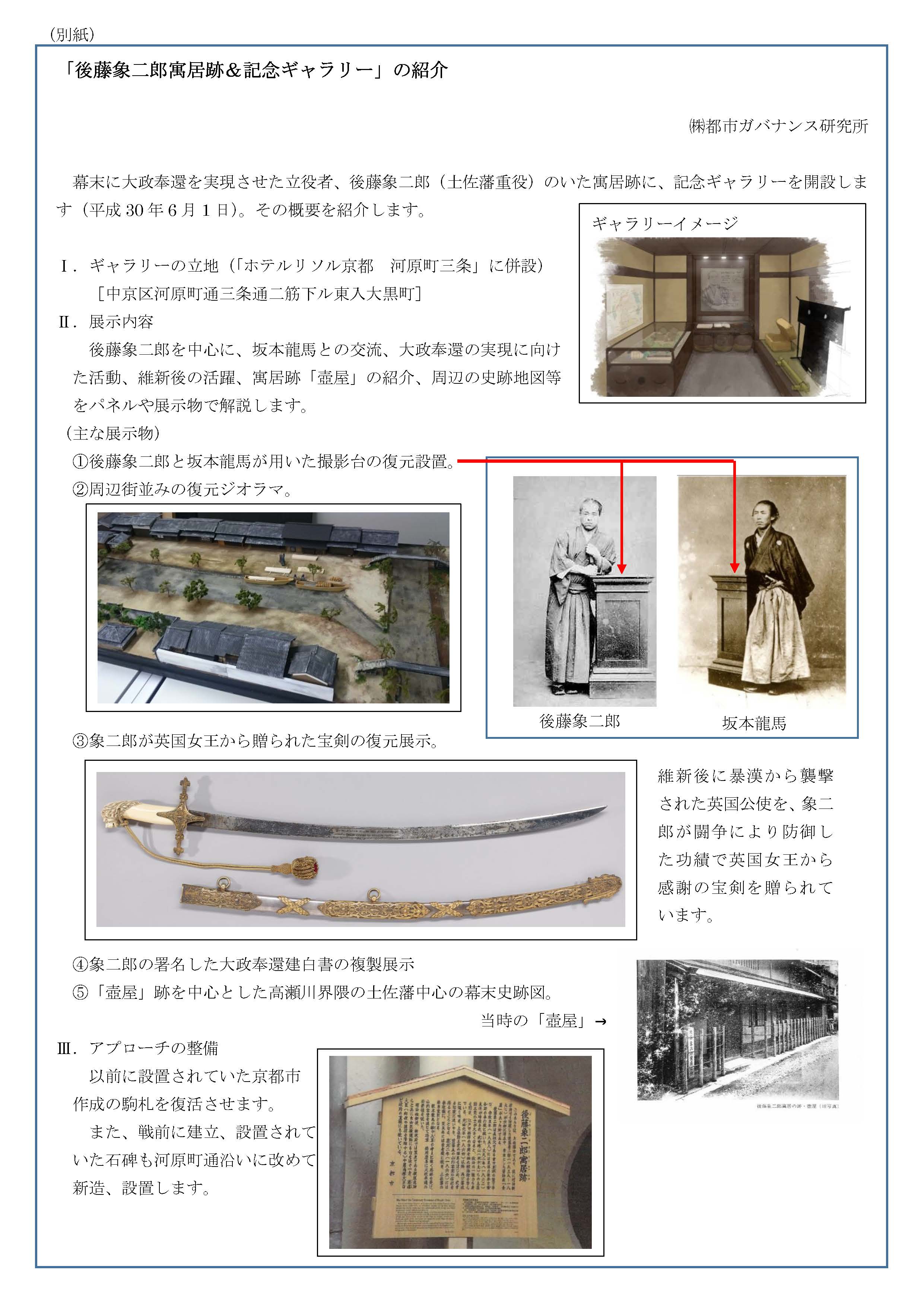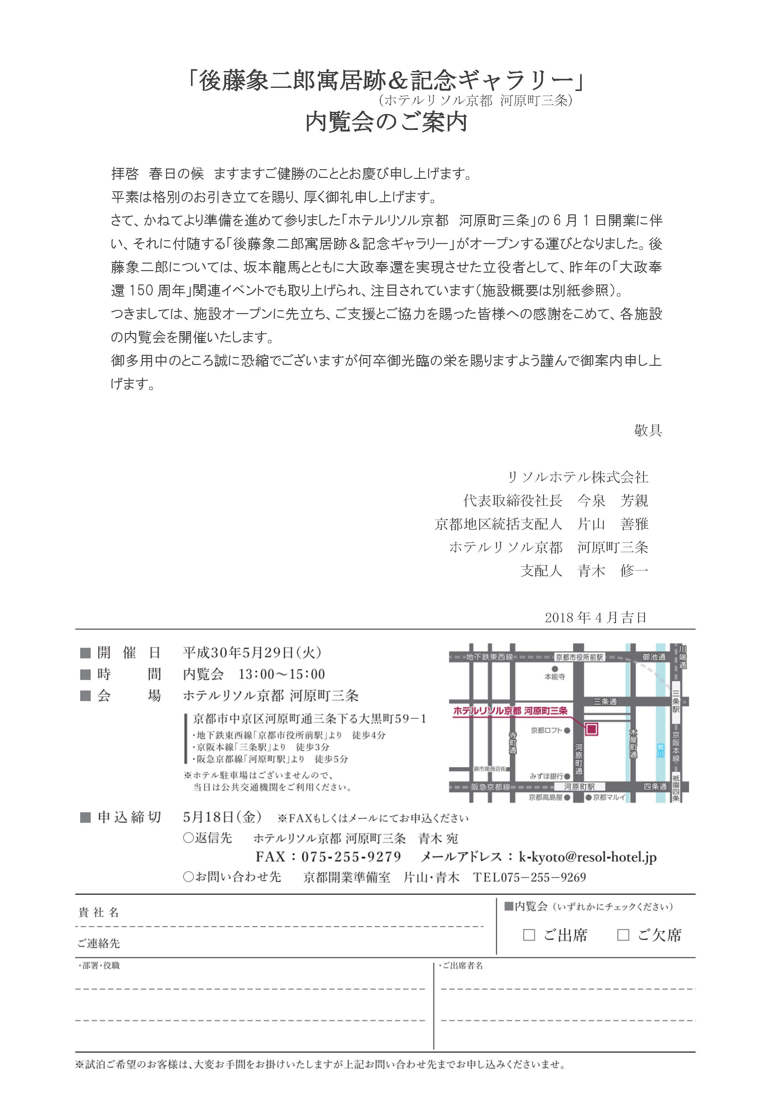 さて、かねてより準備を進めて参りました「ホテルリソル京都 河原町三条」の 6 月 1 日開業に伴い、それに付随する「後藤象二郎寓居跡&記念ギャラリー」がオープンする運びとなりました。後藤象二郎については、坂本龍馬とともに大政奉還を実現させた立役者として、昨年の「大政奉還150周年」関連イベントでも取り上げられ、注目されています。