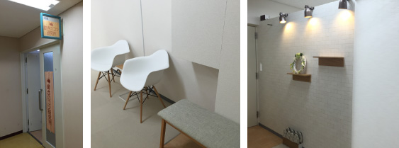 当研究所があるフレンテ西宮西館内はバリアフリーとなっています。研究所内は、白を基調としており、待合スペースはリラックスしやすいナチュラルな雰囲気です。リハビリスペースは、手すりもあり、歩くリハビリが可能です。手のリハビリを行う際は、高さを調整できる机を利用し、必要であれば、ベッドをご用意しております。