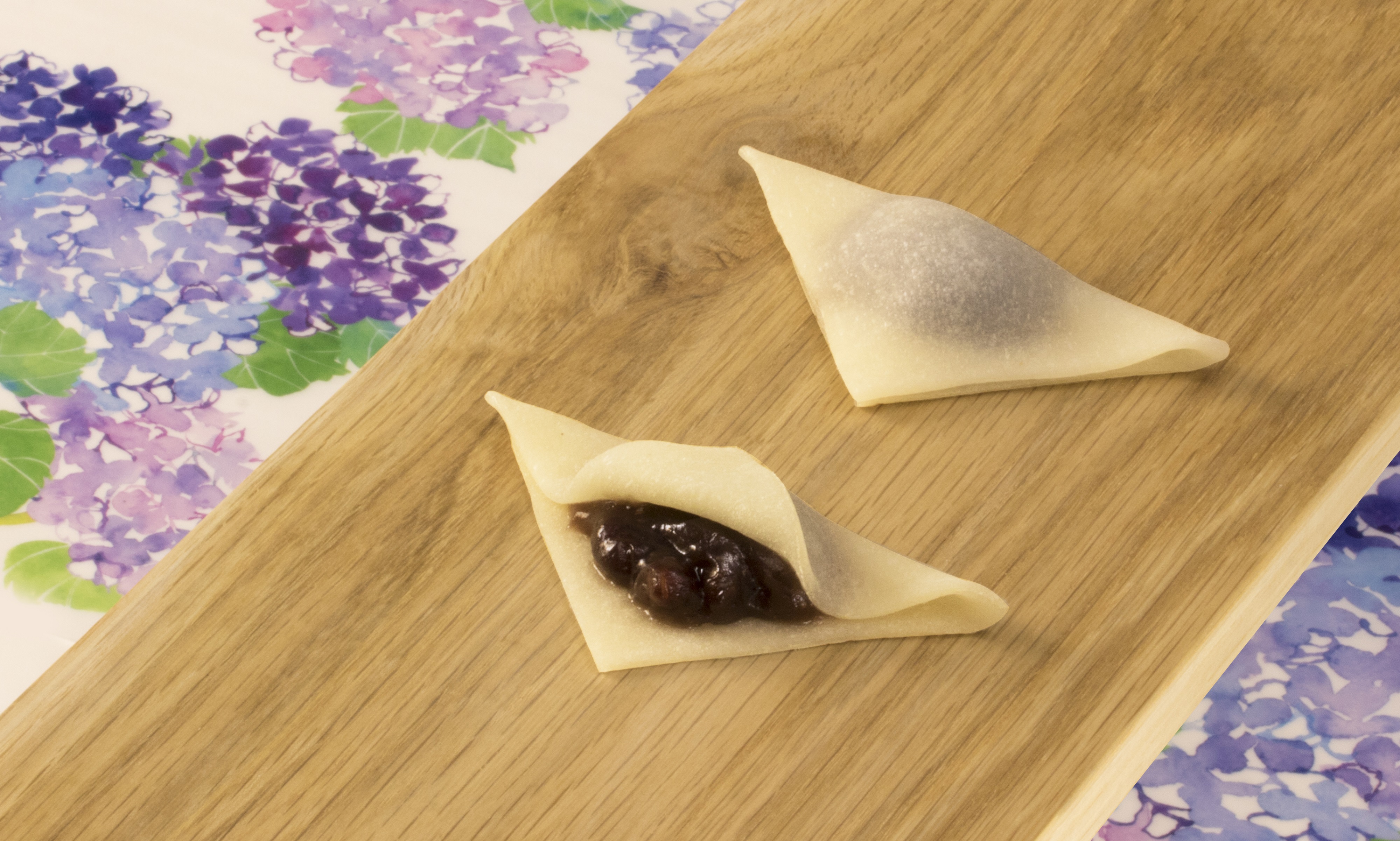 “くるみつぶあん”を入れた四月のおたべ、“ほうじ茶あん”を入れた五月のおたべに次ぐ、第3弾の六月のおたべは、あっさりとした“こしあん”に、くちどけのよい“たれ”を合わせて水ようかんのような口当たりに仕上げた“こしあんたれ かのこ入り”のおたべスイーツです。