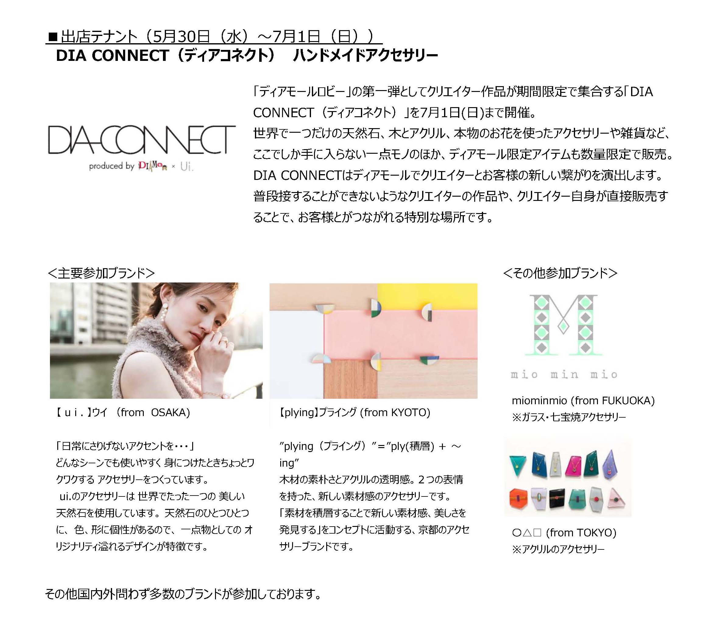 世界で一つだけの天然石、木とアクリル、本物のお花を使ったアクセサリーや雑貨など、ここでしか手に入らない一点モノのほか、ディアモール限定アイテムも数量限定で販売。 DIA CONNECTはディアモールでクリエイターとお客様の新しい繋がりを演出します。普段接することができないようなクリエイターの作品や、クリエイター自身が直接販売することで、お客様とがつながれる特別な場所です。