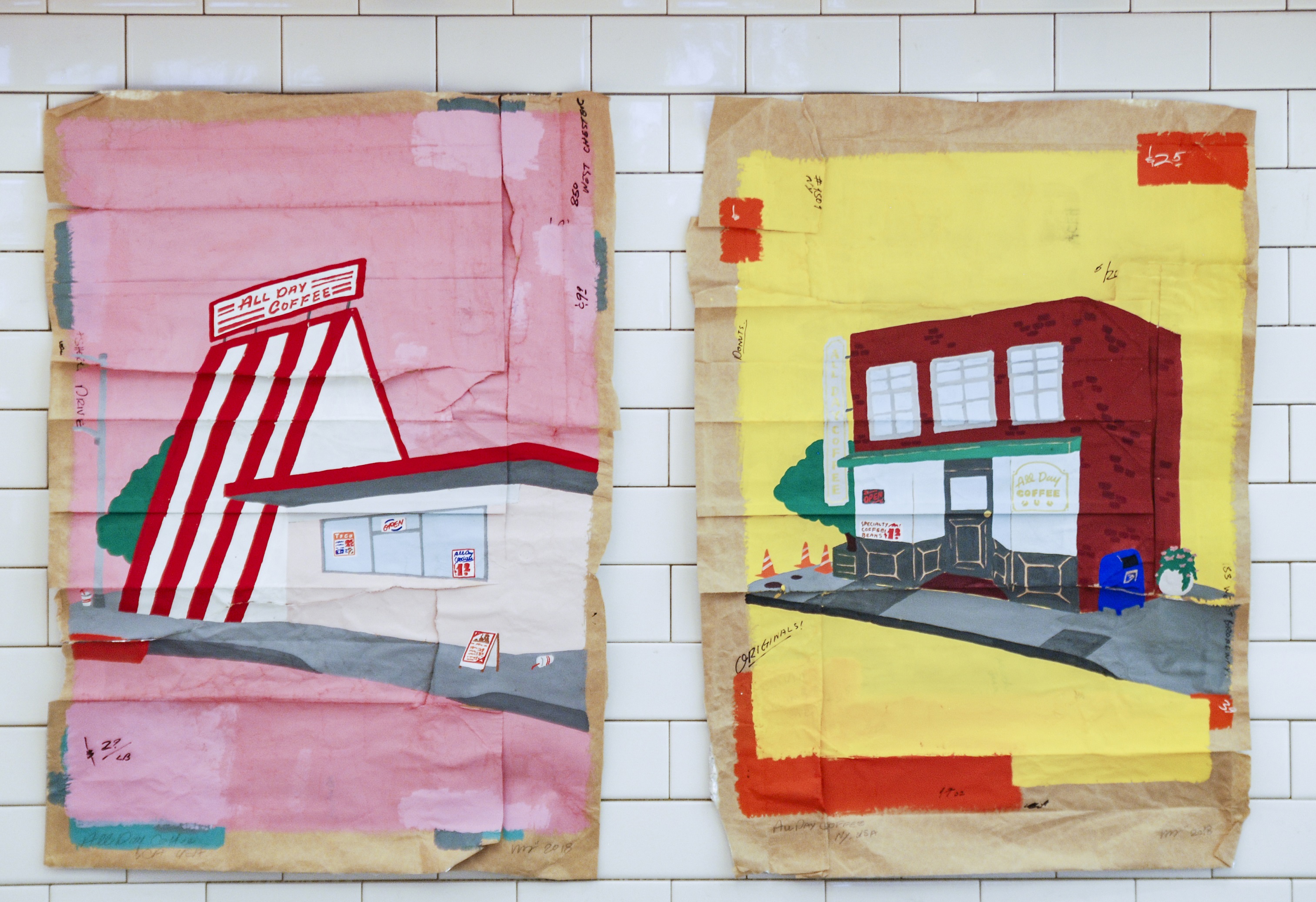 “もしALL DAY COFFEEが何処かの都市にあったら”という設定の元、LAとNYにある架空の「ALL DAY COFFEE」の絵が完成。コーヒー豆が入っていた袋をつなぎ合わせ、キャンパスにした。