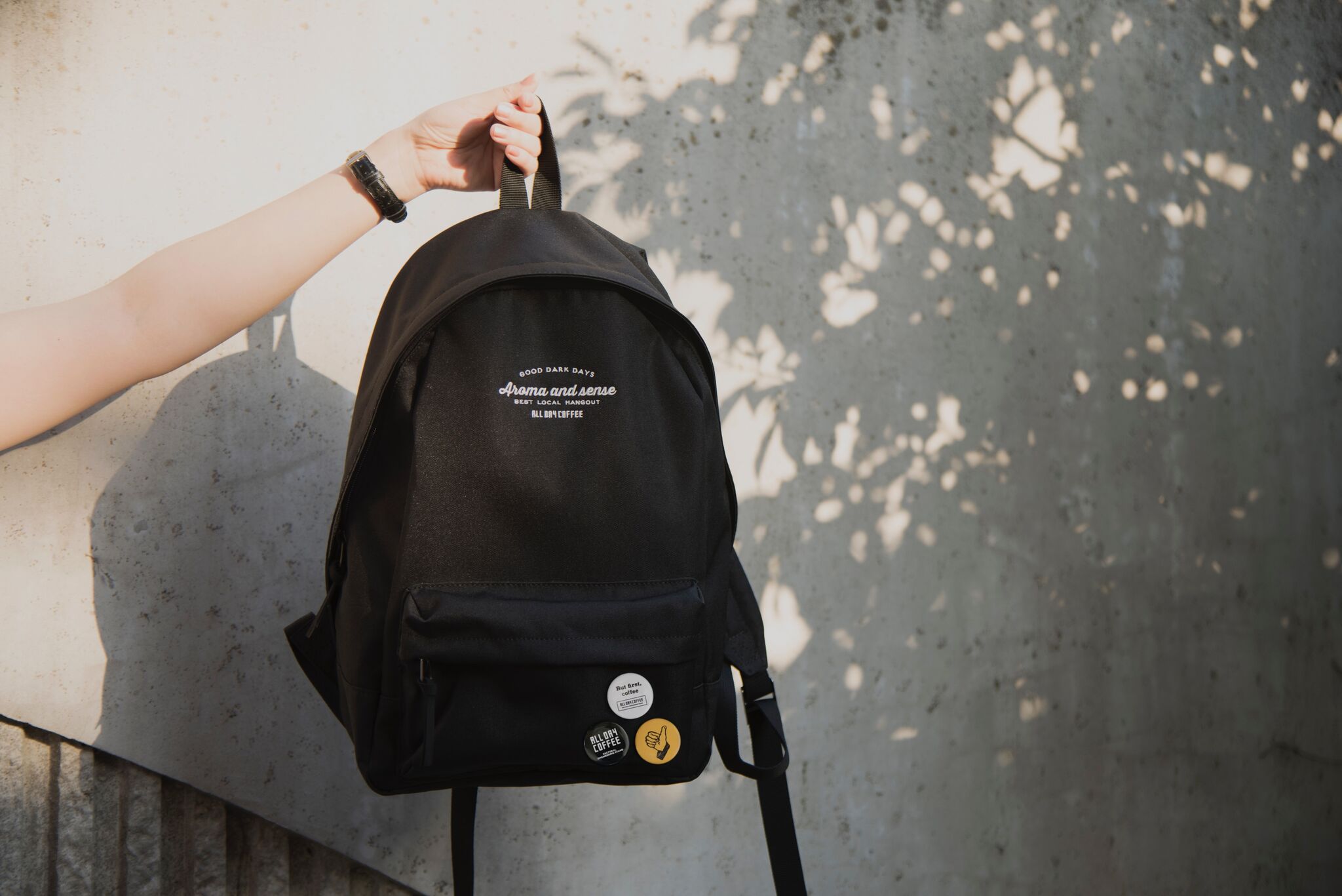 ALL DAY COFFEEオリジナルグッズからNEW ITEM「リュックバック」が登場。外ポケット付きのシンプルなデザインに、刺繍のロゴがポイント。PCもA4サイズもしっかり収納。通常のデイパックよりもひとまわり小ぶりに仕上げることで、すっきりとしたシルエットに。ユニセックスで使えるマストアイテムです。
