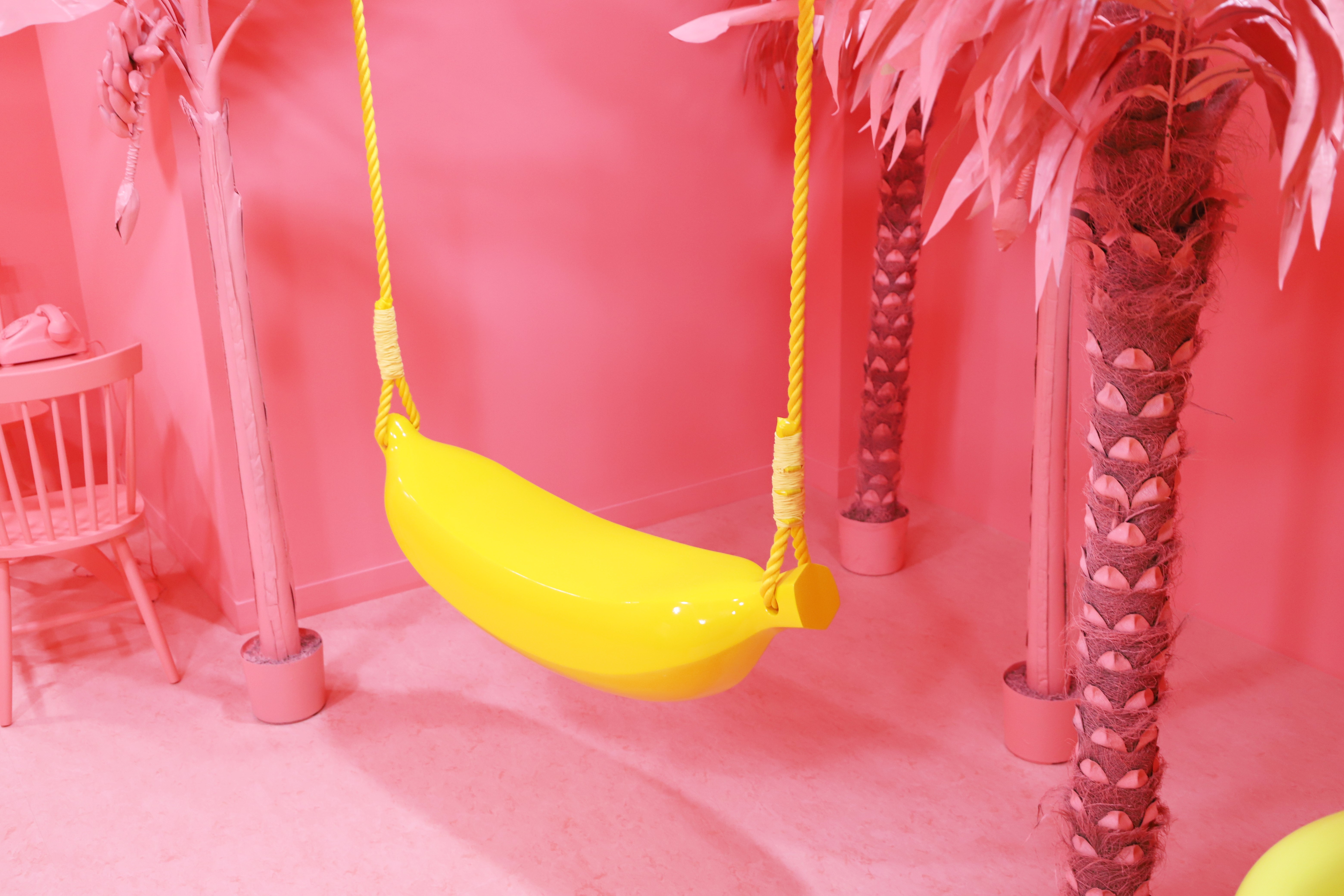 当館は「映える!盛れる!パぺる!」をテーマに“インスタ映え”だけを意識し、ピンクをメインカラーにしたフォトジェニックスポットを多数ご用意いたしました。約20坪ある会場全体をピンク色に染め、乙女かわいい空間に仕上げました。会場内の随所にはピンクのヤシの木を設置し、バナナ型のブランコ、ハート形のドライクッションを入れたプール、天井から1500本の黄色とピンクのバナナを吊るしたスポット、天使の羽を描いたウォール(壁)のほか、クリスタルを吊るしたミラールームなどこんなのがあったらいいなという“想像”を“現実”にした全8つのフォトスポットをご用意しております。