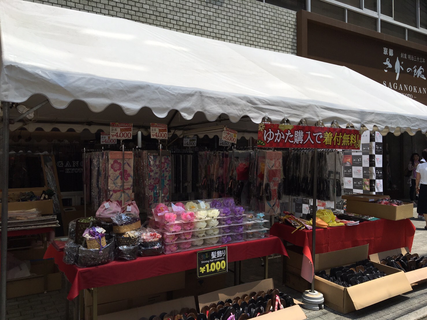 京都の夏の風物詩「祇園祭」。京都で着物販売を行う「さがの館」では、祇園祭前祭宵山の3日間京都四条本店の店舗ビル前に特設スペースを設け、浴衣、帯、下駄などの商品販売を行います。当場所は巡業を行う山鉾の1つである「菊水鉾」の目の前に位置しております。通常当店では通常浴衣の販売は行っておりませんが、期間中は1,000枚以上の浴衣と帯、下駄のセットを5,500円で販売いたします。限定商品の光る髪飾り(1,000円)も販売いたします。