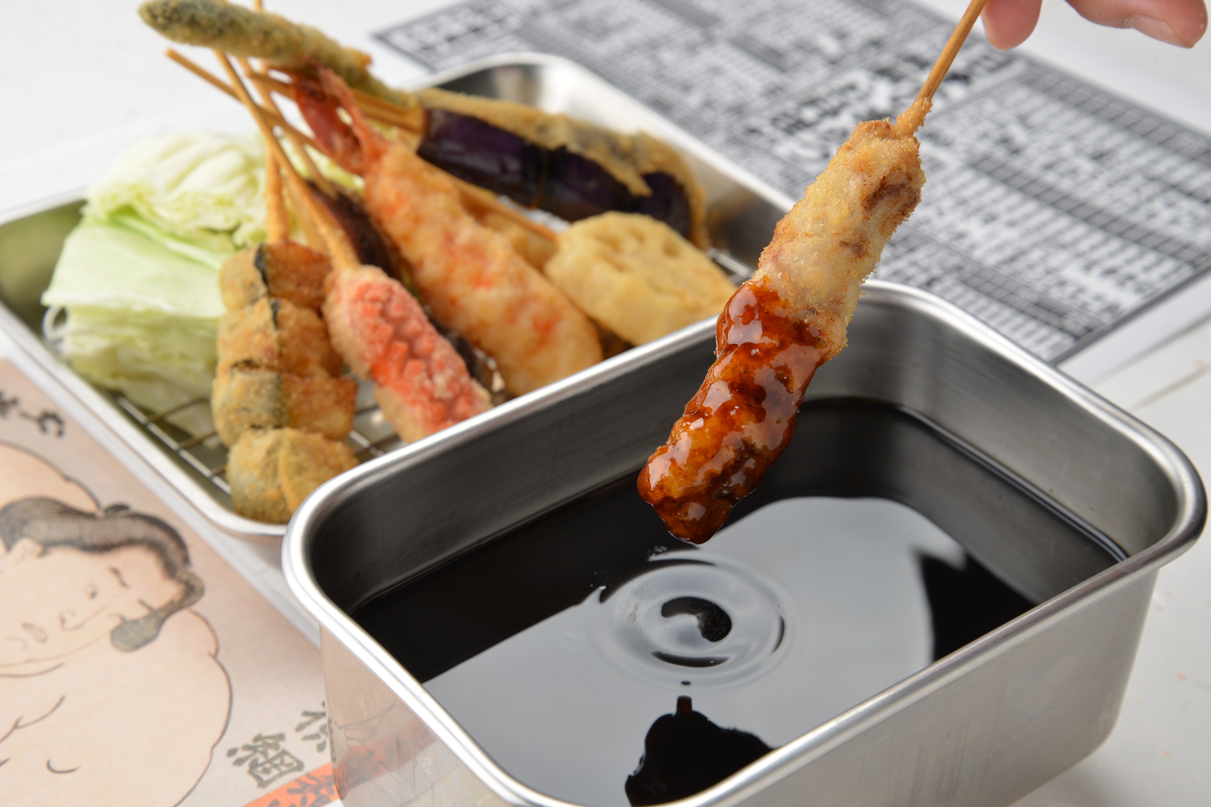 ソースは、職人が試行錯誤を繰り返して調合された、ほんのり甘口の秘伝のソースで串かつとの相性は抜群です 。もちろんソースの二度漬けは禁止です。