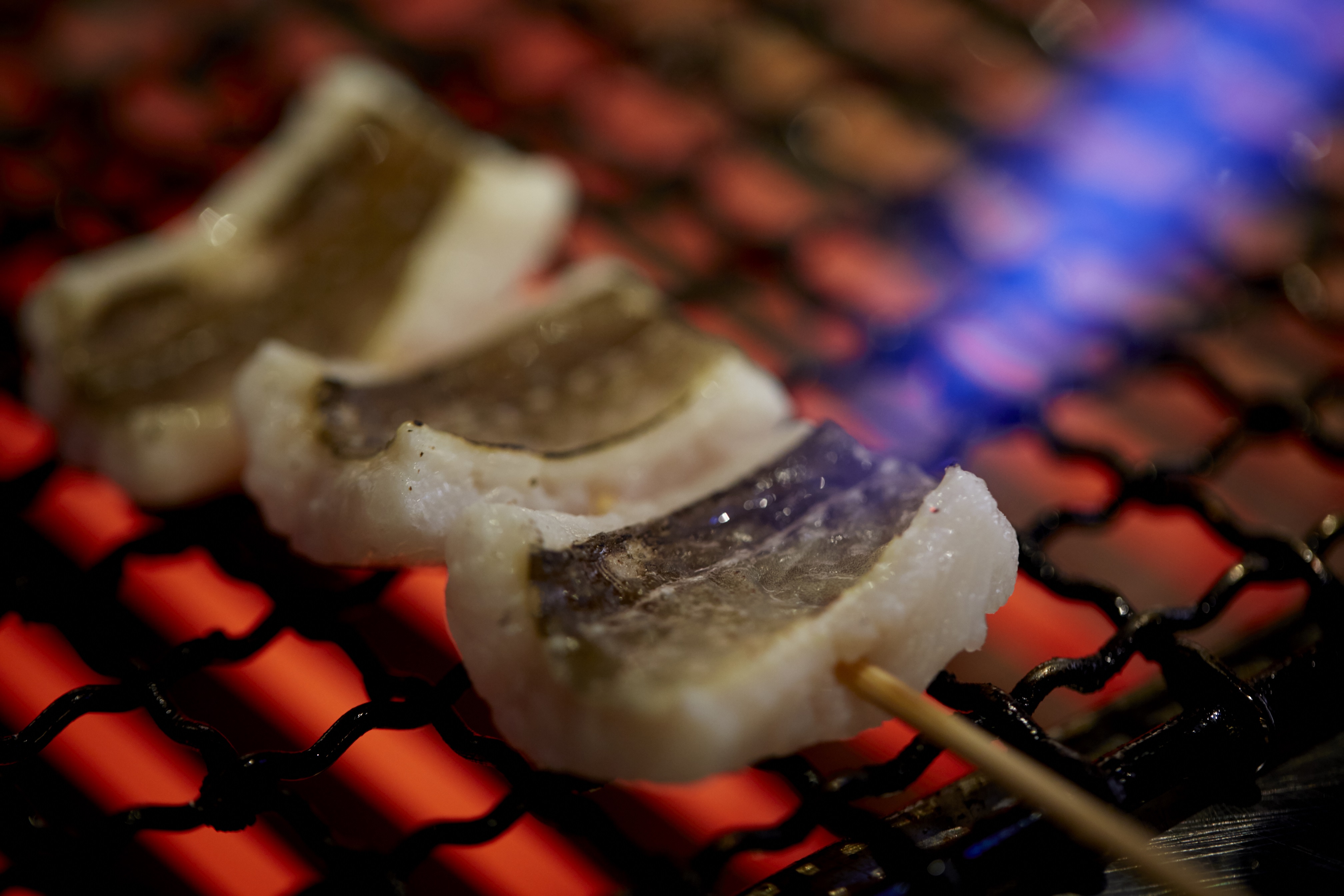 肉厚で脂ののりの良いプレミアム穴子を、香ばしく焼き上げました。素材の味を生かせる為に、シンプルに塩(対馬産)と山葵でお召し上がりください。