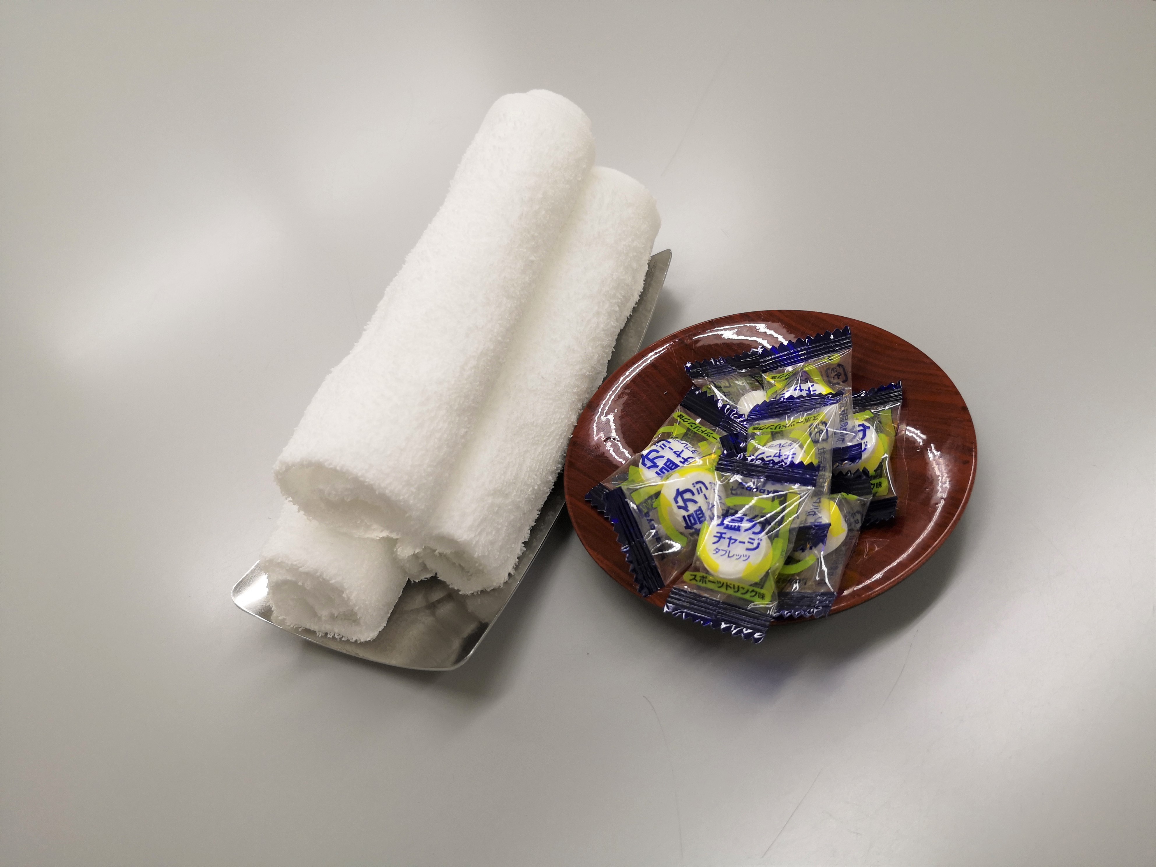 入室時にスタッフが気象庁発表の現在の外気温をお伝えします。その際、その日のエアコン温度を設定していただきます。外気温と会議室のエアコン設定温度が高ければ高いほど割引率は大きくなっており、特典として冷たいおしぼりと塩タブレットをプレゼントいたします。