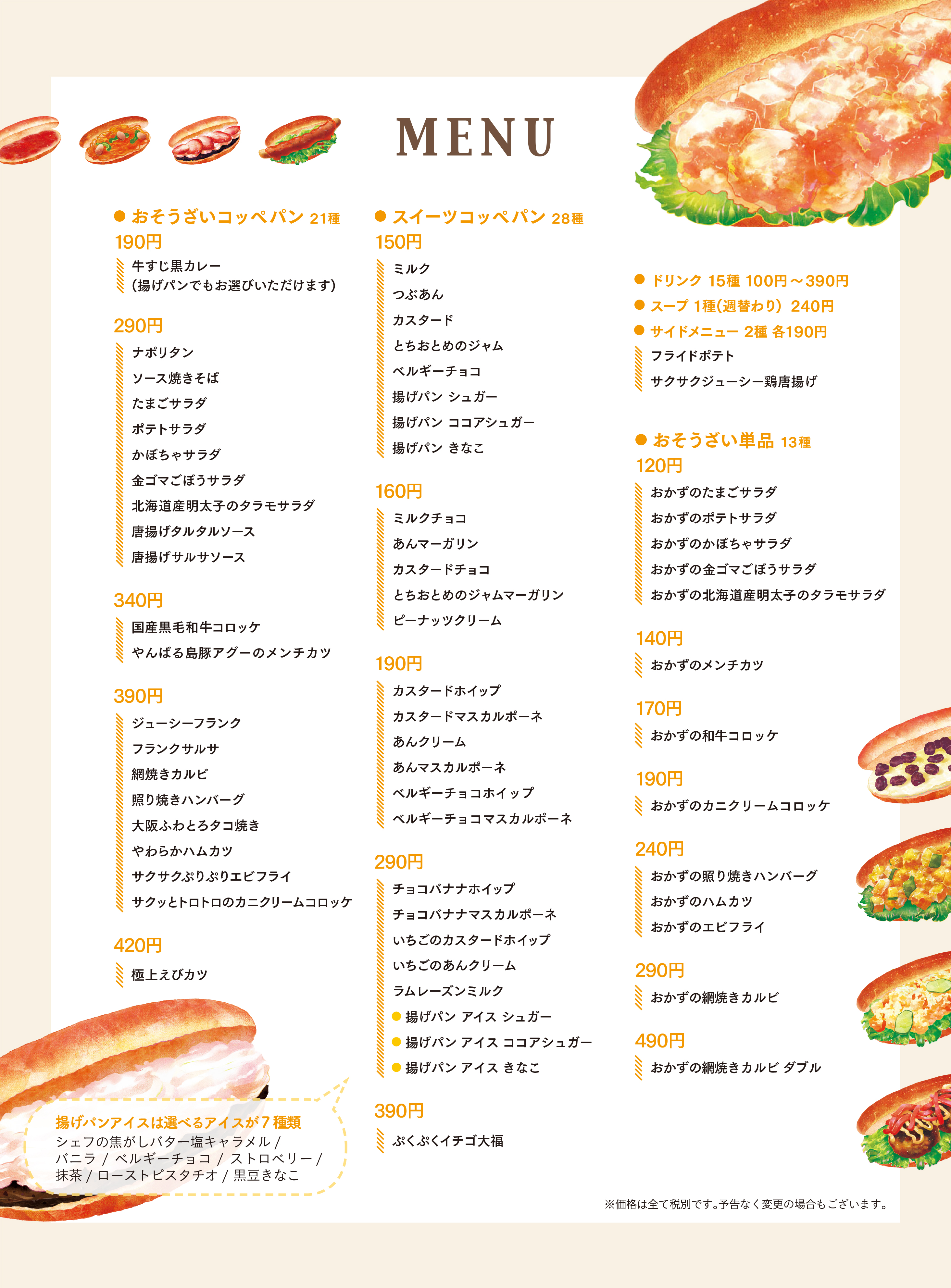 揚げパンは4種類から、アイスクリームは7種類からお選びいただき、