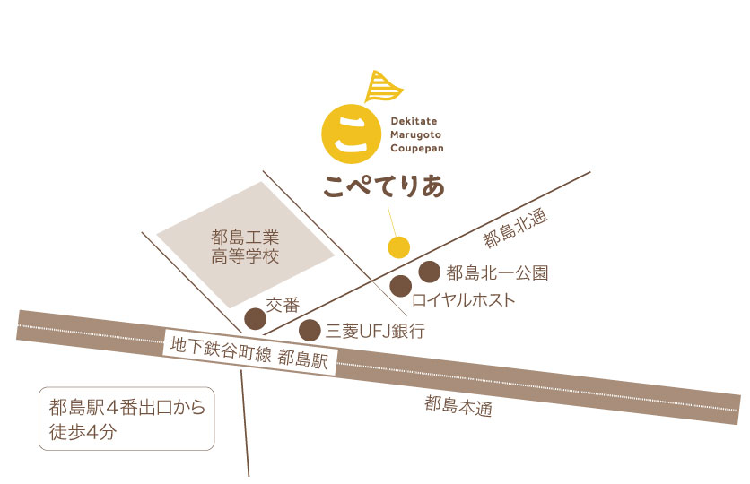 おなじみの日本発祥のコッペパンは給食止まり。そんな古い固定概念を撲滅したい思いでコッペパン専門店「こぺてりあ」は発足いたしました。店名は “コッペパン+カフェテリア(食堂:スペイン語)”の造語。お食事、おやつなど様々なシーンでお好きなものをセルフで選べるバラエティの豊富さ、手軽さ、健康志向に加え、美味しく食べるシーンを想起させることをイメージし命名いたしました。