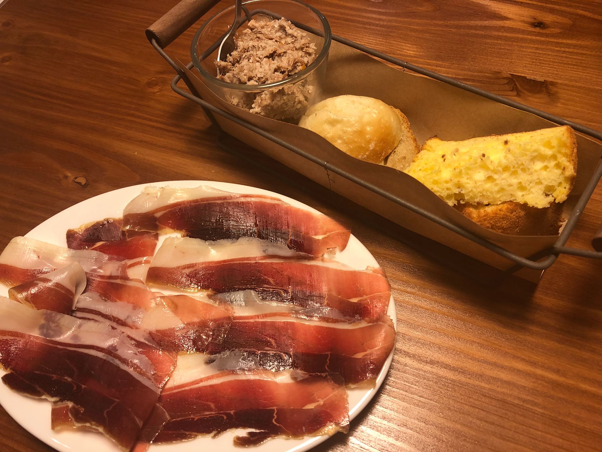 ハモンセラーノ(生ハム)」(¥580)「猪肉のポルケッタ」(¥480)、オイル漬けにした鹿肉を使った「コブ風“森のツナ”