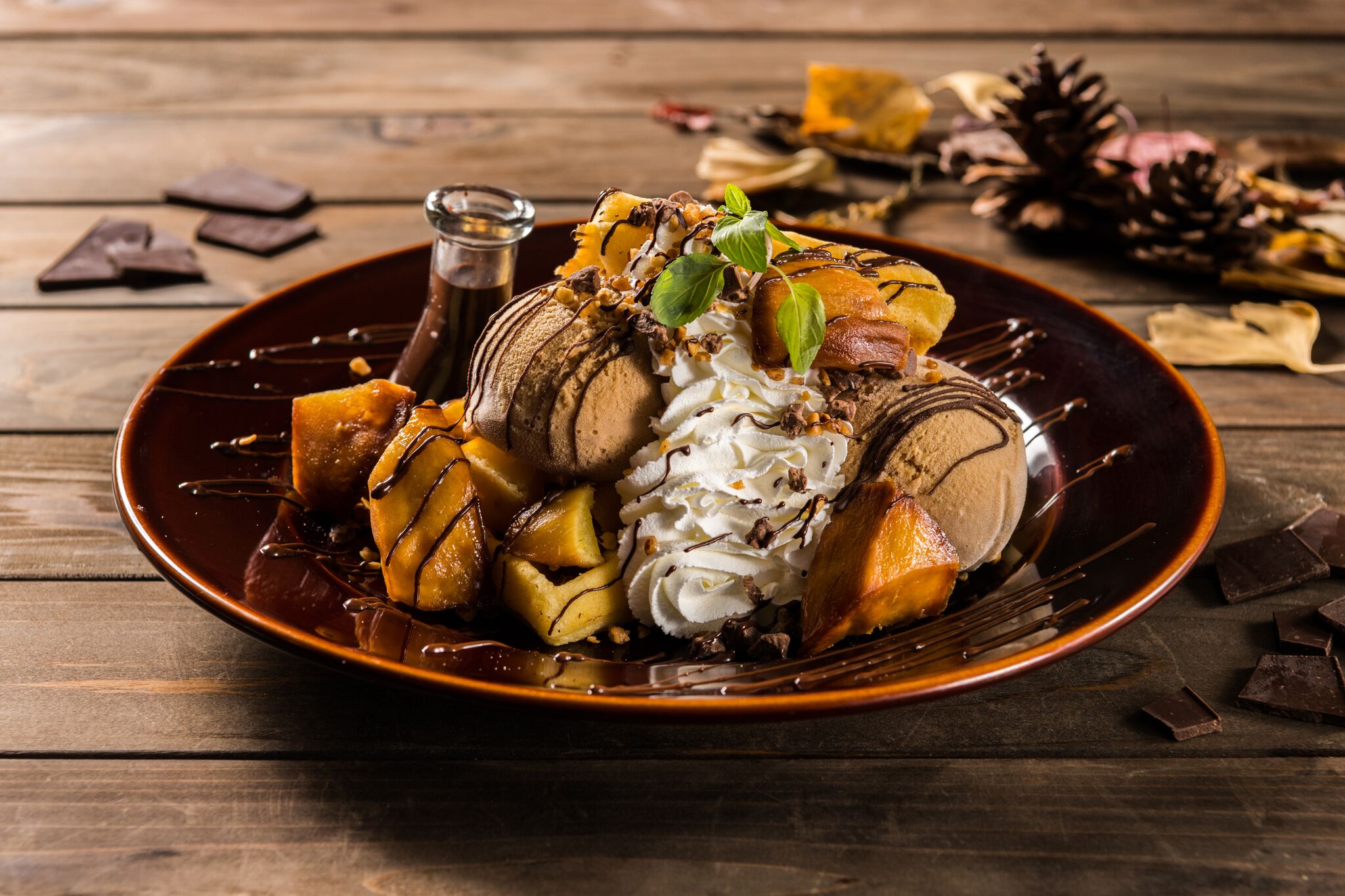 キャラメリゼしたスイートポテトと濃厚なキャラメルアイスをトッピングした、大阪限定ワッフルが登場。ダークチョコレートをお好みで。