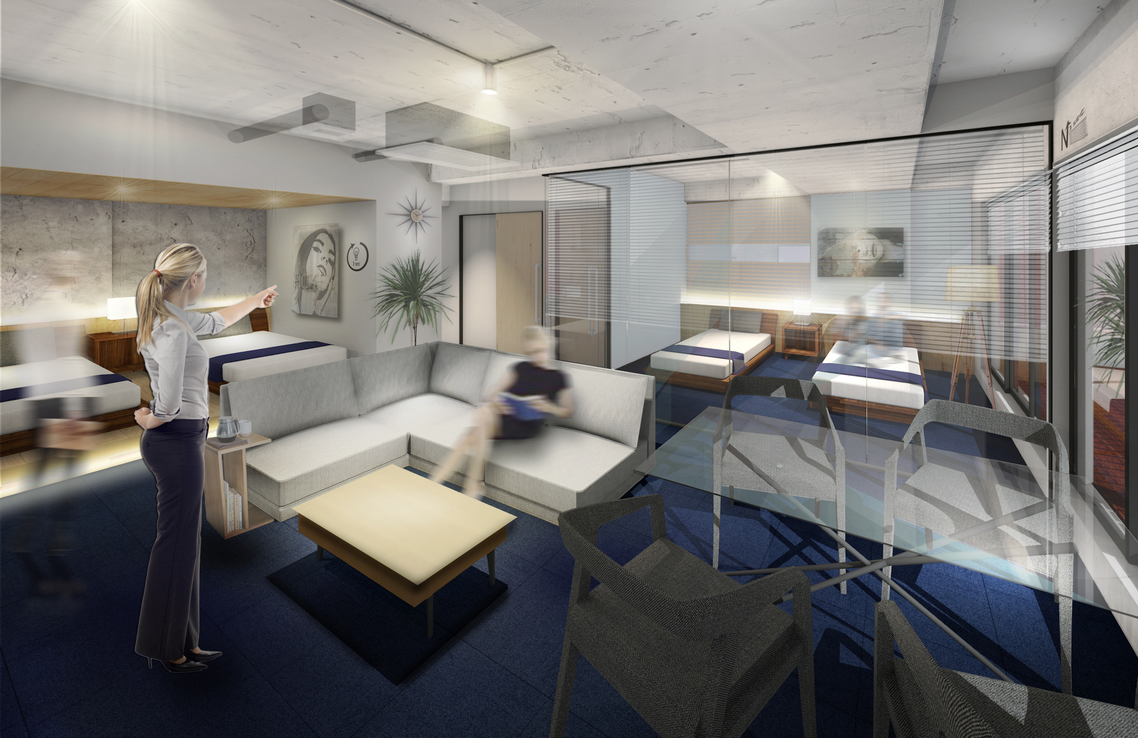 8月29日オープンのSTAY in the City AMEMURA客室にて手ぶり動作(モーションキャプチャ)によるIoT家電・家具操作システムの実証実験を行いました。当システムは、客室に設置したセンサーで宿泊客の動作を検知し、ジェスチャ(モーションキャプチャ)にてテレビ・照明・カーテンなどの家電・家具操作が行えます。人間の動作(ジェスチャー)をセンサーによってモーションキャプチャすることで、この操作を実現しています。ジェスチャにて操作が可能なため、本来必要なスイッチ/リモコンは不要です。特定の操作方法としては、照明に向かって左手で指を指す動作をすることで照明が点灯、右手を握ってバツを描くことにより照明が消灯します。また右手でジェスチャの指示を送りチャンネルの選定や、音量の上げ下げ、メニューの開閉も可能です。ジェスチャでの家電操作が可能になることで部屋の照明スイッチを入れるためにソファーやベッドから立ち上がることなく操作が可能です。旅先で疲れて帰って来た後、リモコンを取りに立ち上がることもなく音声でコントロールする必要もありません。