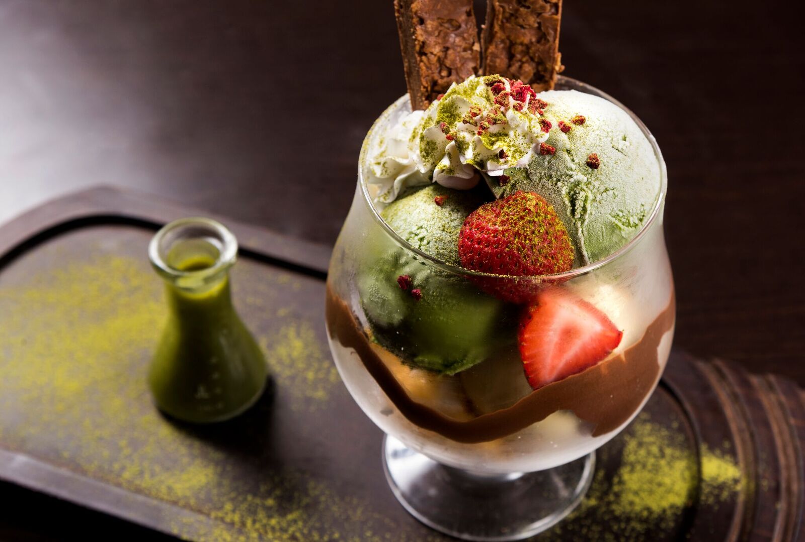 グリーンティーアイスとバニラアイスにホワイトチョコレートグリーンティーソースをかけてお召し上がりください。