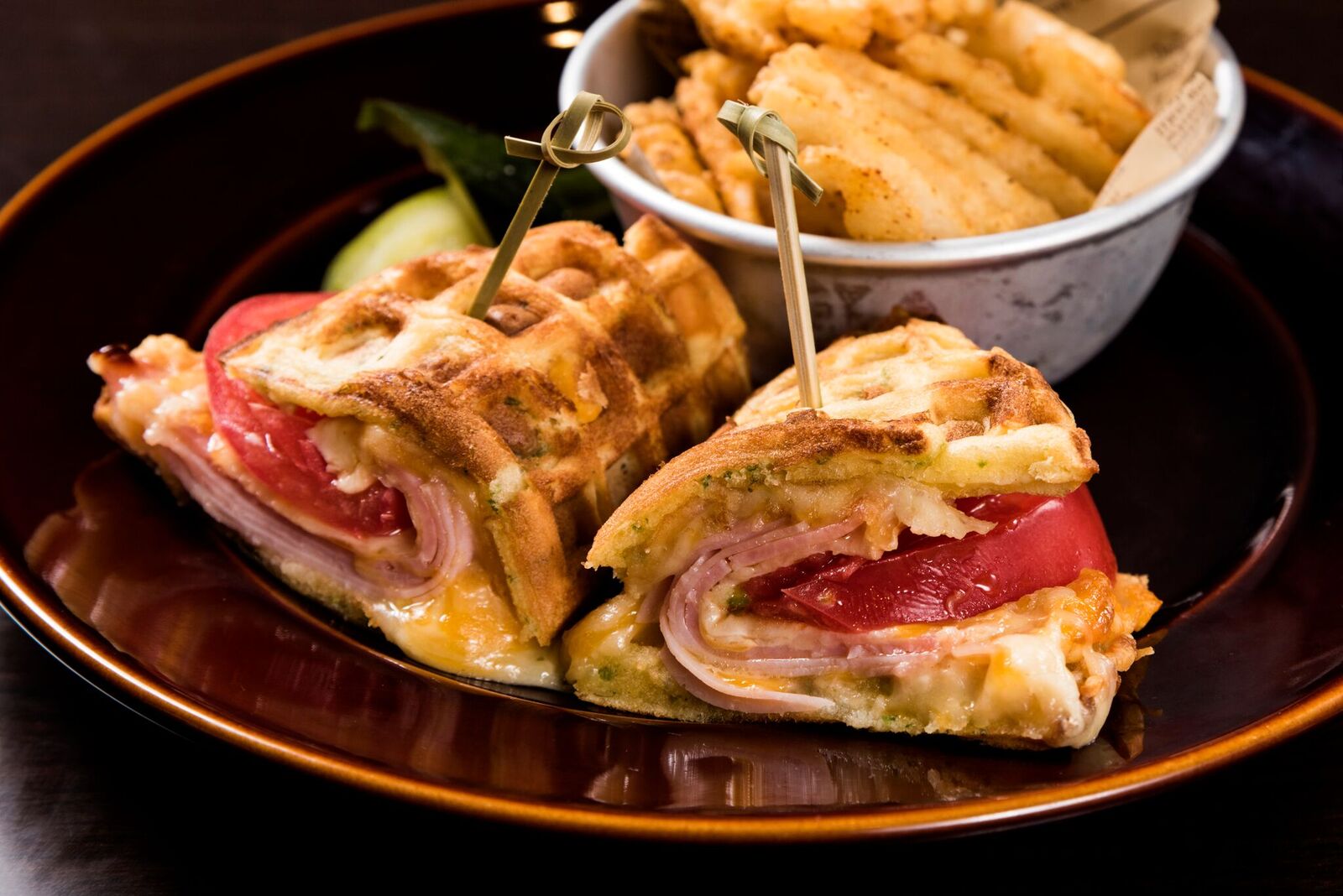 ふわふわのワッフル生地にとろけるチーズとハム、トマトを挟んだクロックムッシュ風のサンドイッチ。