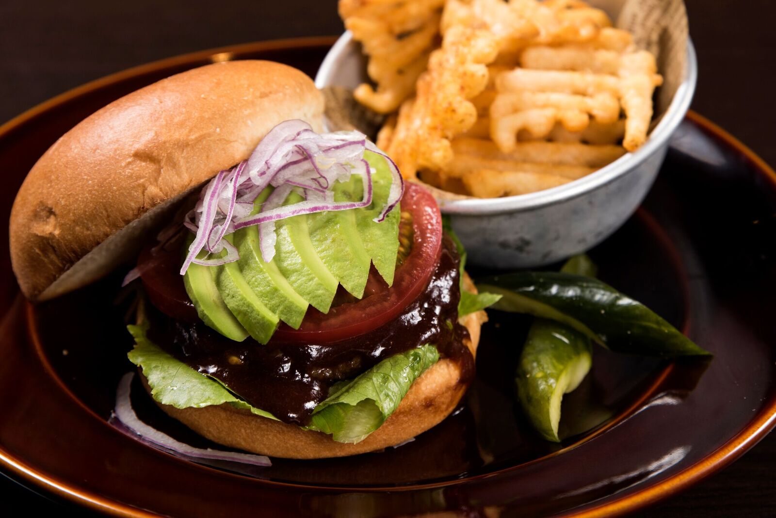 肉厚のパテとアボガド、トマトの入ったボリューム満点のハンバーガー。