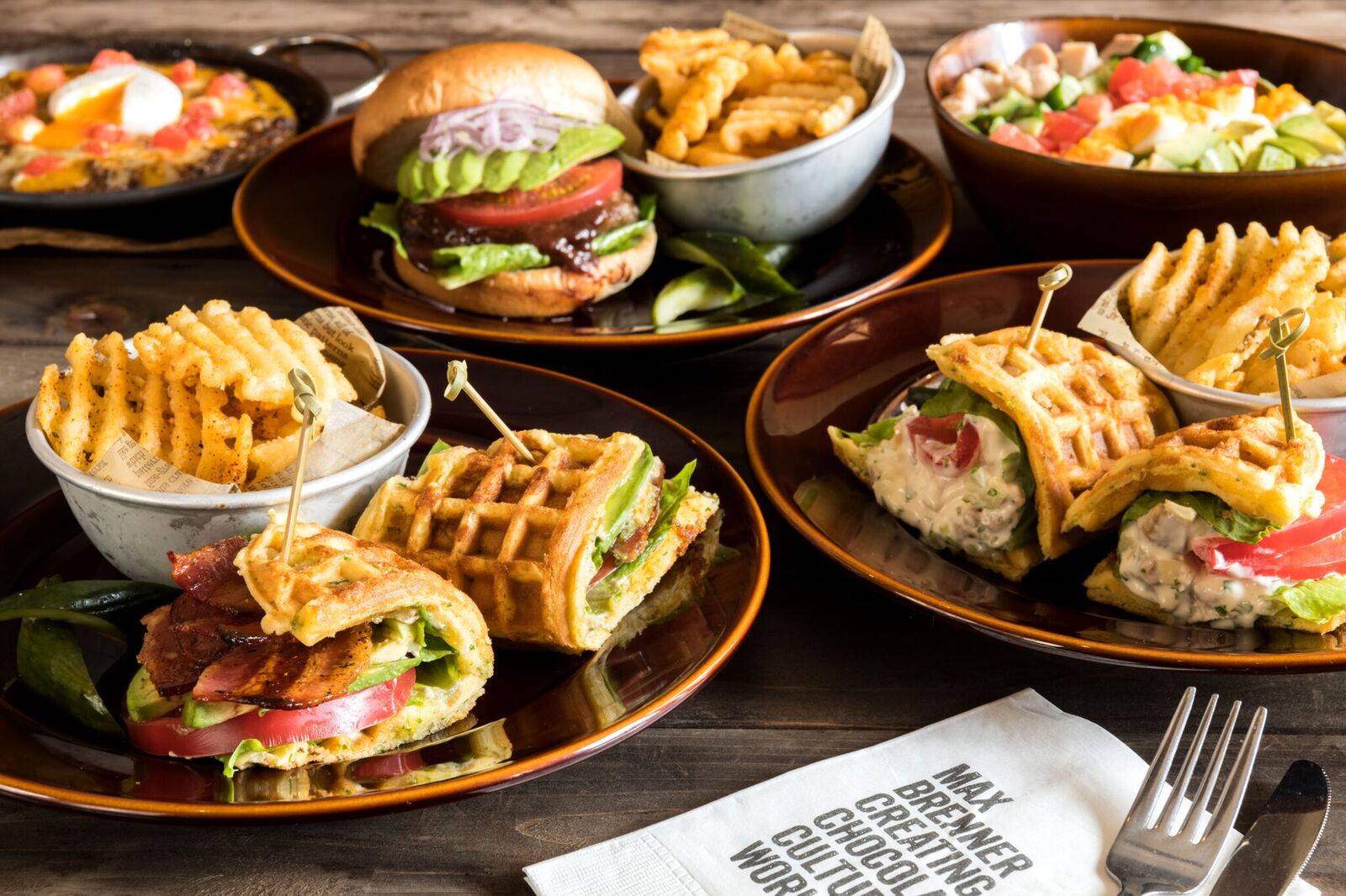 セイボリー(フード)メニューがさらに充実し、本国で人気のワッフルサンドイッチやハンバーガーが登場いたします。 「MAX クロックムッシュワッフルサンドイッチ」は、オーダーが入ってから焼き上げるワッフルに、ハムやチーズをサンドしたクロックムッシュ風のサンドイッチです。また、肉厚のパテにアボガド、トマトの入ったボリューム満点の「アボガドバーガー」もラインナップします。