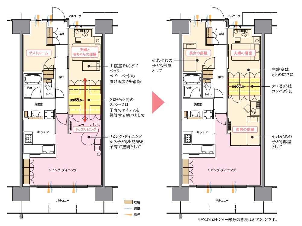 家族構成やライフスタイルの変化に合わせて間取りを自由に手軽に変えられる、長谷工コーポレーション(「ルネ西宮仁川」設計・施工会社)独自の可動収納ユニット「UGOCLO(ウゴクロ)」を、関西の新築分譲マンションで初めて採用。居室と収納の広さを変更できるため、今も未来も家族が心地良く暮らすことができます。足元にキャスターを備えているため、女性一人でも楽に移動することができ、天井・床との固定も簡単です。