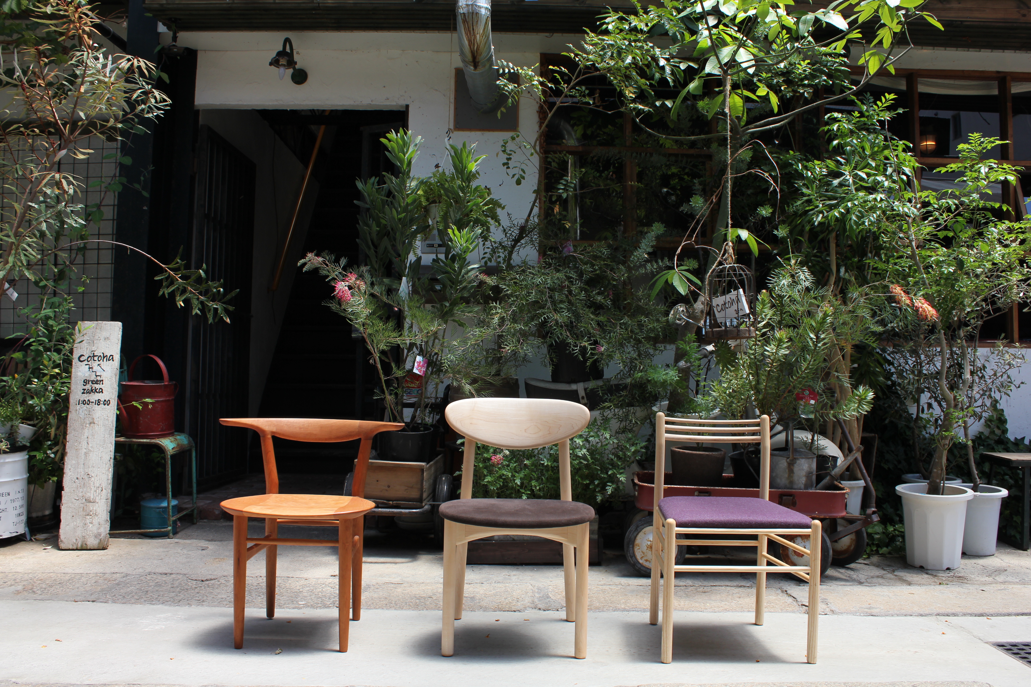 平山日用品店は、職人(夫)とデザイナー(妻)の2人が共同で無垢の木の家具を製造・販売しているお店です。経年変化が楽しめる無垢材と「機能から生まれる形」を大切にした飽きのこないデザインによって、長く使い続けられる家具を作り続ける事を目指しています。通常は宇治にある店舗・工房でオリジナル家具の展示と北欧や日本のアンティーク雑貨の販売を行っておりますが、この度、広く皆様に新作椅子をはじめとした無垢材の家具を体感して頂くために、京都市内の観葉植物店 Cotohaのギャラリーにて3回目の個展を開催致します。是非たくさんの緑の中で「平山日用品店」をお楽しみ下さい。