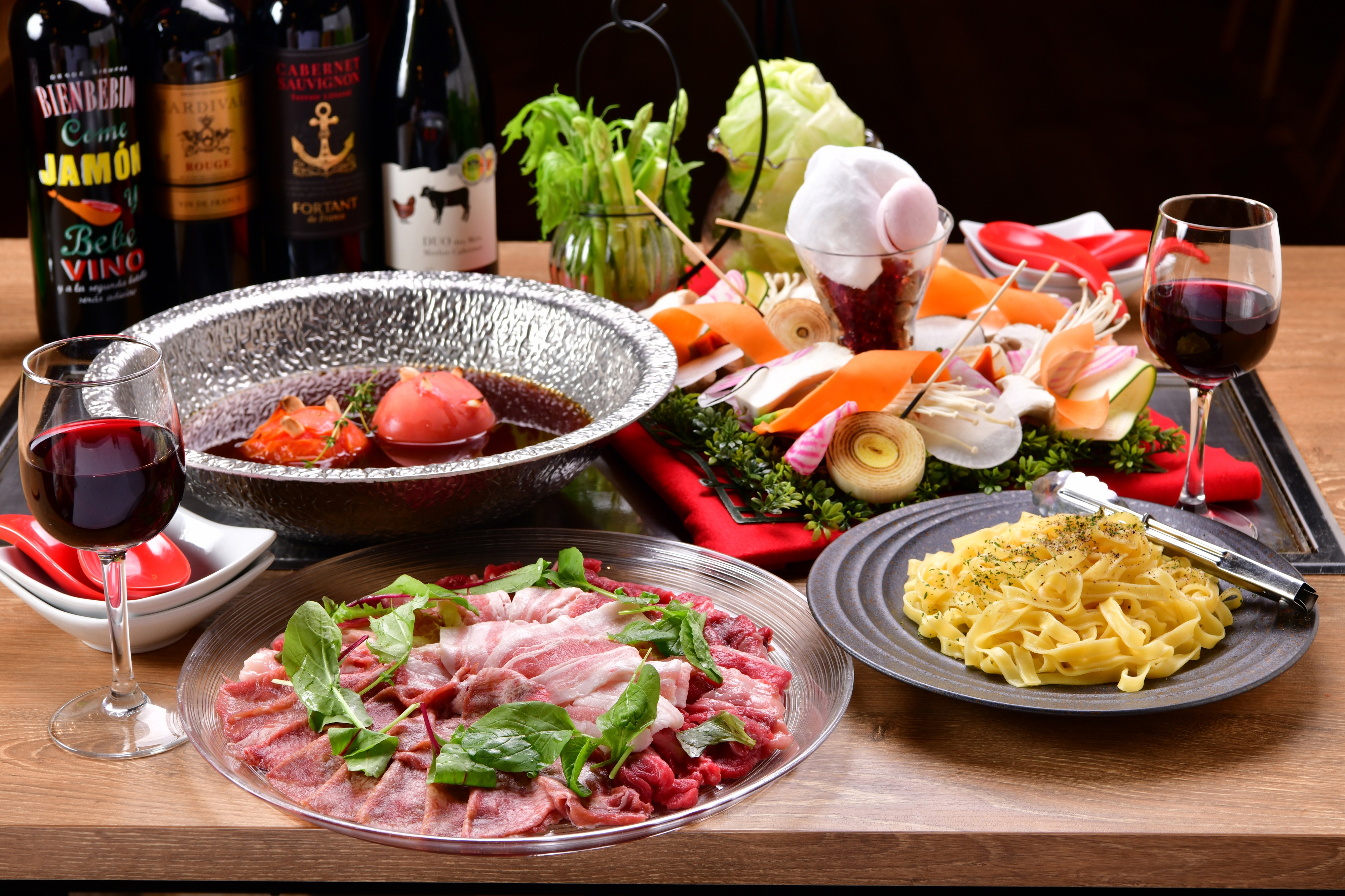 【赤ワイン鍋】前菜3種盛/トマトとモッツァレラのカプレーゼ/鮮魚のカルパッチョ/カマンベールの和牛すじボロネーゼ焼/赤ワインと八丁味噌の肉しゃぶ鍋/〆のフェットチーネパスタ/本日のプチデザート