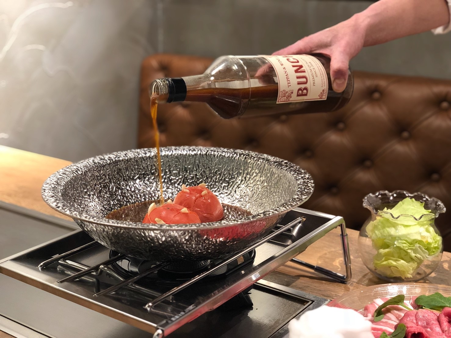 2018年5月29日に大阪・お初天神通りにオープン。鉄板焼きをはじめ、可愛らしい見た目が特徴の創作料理「世界三大珍味の鉄板肉手まり」や、ホウレン草の上にウニをのせた「ウニほうれん草」など、メニューは80種類以上をご用意しております。赤・白のボトルワイン無制限飲み放題は、店内のサーバーで自由に注ぐセルフスタイル。お客様に楽しんでいただきたいとの思いから、7月には、つかんだお肉の重さを予想し、ピッタリだと料金が無料になる「ローストビーフのつかみどり」などのユニークな企画も行い、話題を集めました。