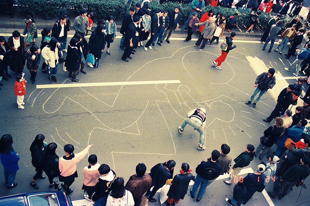 また、今回は特別に、1988年にヘリングが来日した際の写真の展示を西日本初公開。今年8月に東京・表参道ヒルズで史上初展示されたこの写真群はなんと、日本のBROOKLYNG ROASTING COMPANY社長、岸田氏の弟によって撮影されたものなのです。雑誌の企画でゲリラパフォーマンスを装い、ヘリングが表参道にチョークで落書きをしている様子が写されています。