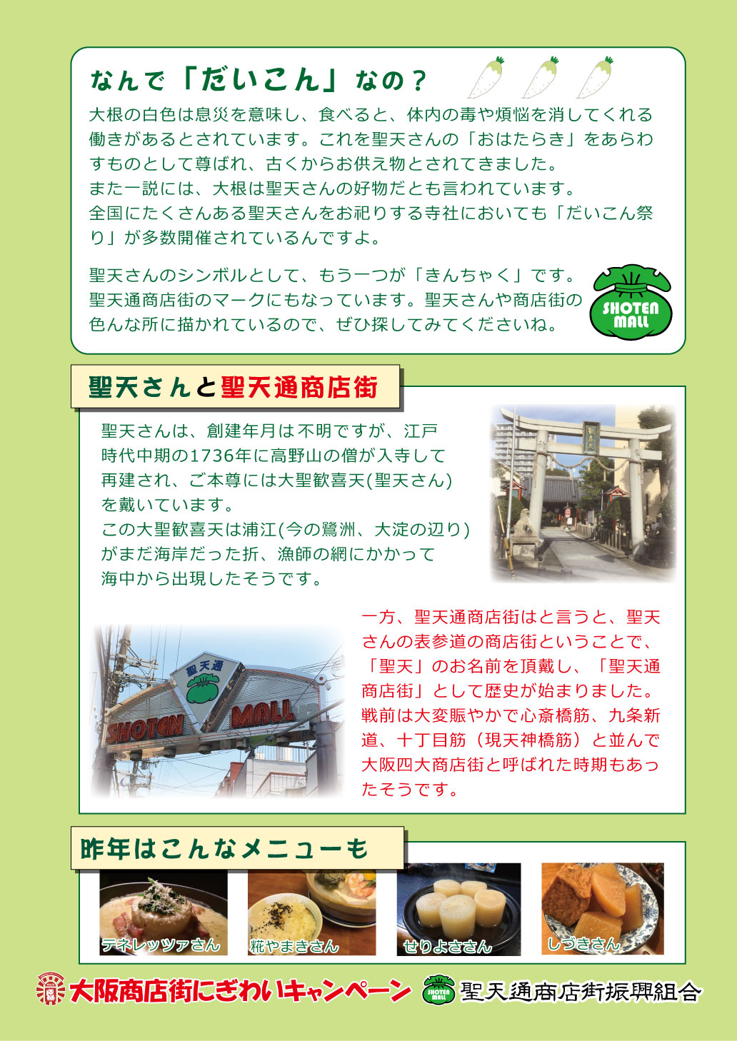 イベント参加の11店舗には期間中、商店街とご縁のある聖天了徳院(聖天さん)でご祈祷していただいた、ご利益タップリの「聖天だいこん」を料理の材料として使用してもらっています。