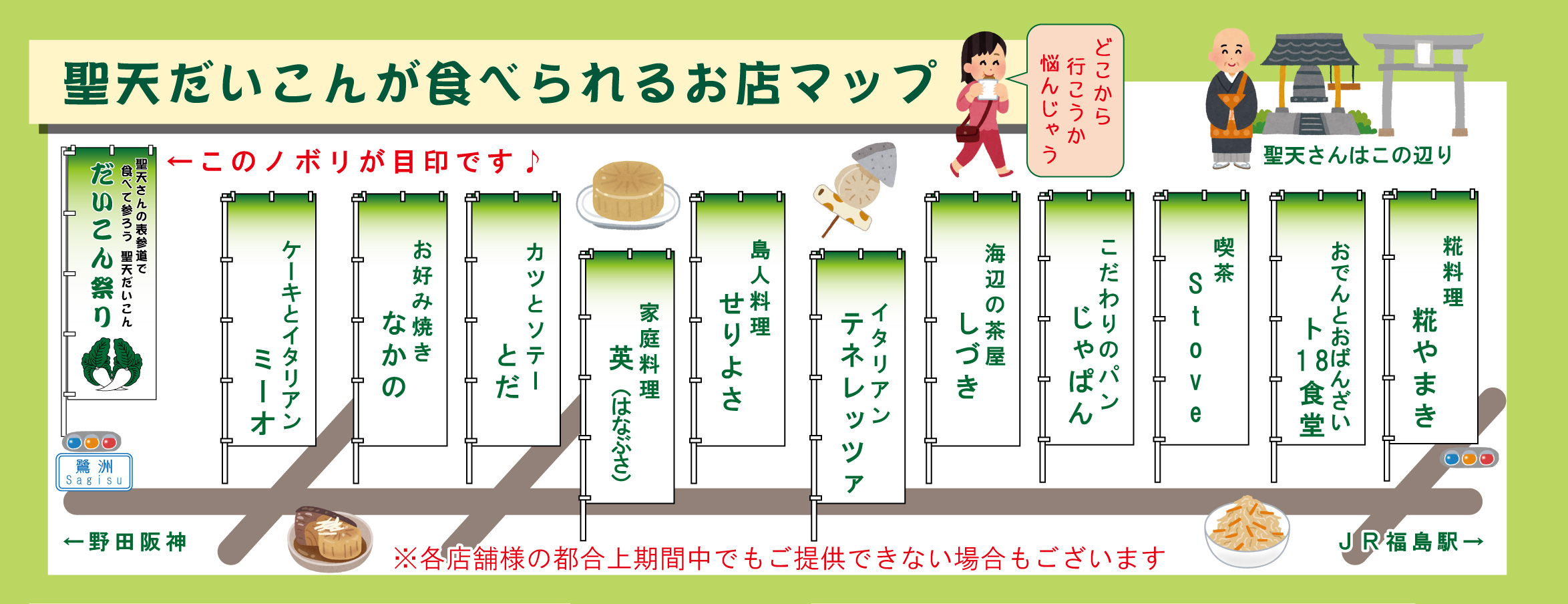 グルメの街福島の老舗商店街でご利益タップリの「聖天だいこん」を食べ歩くグルメイベントを開催します。参加店はいずれもグルメの街・福島で生き残ってきた実力派のお店ばかりです。