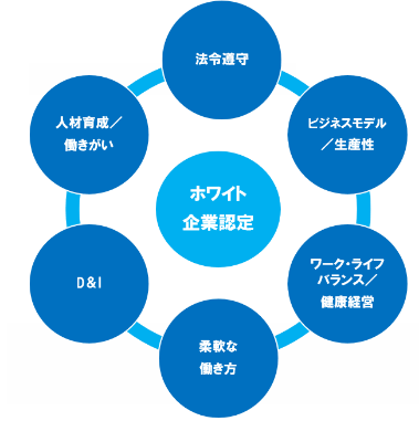 「ホワイト企業」とは、お客様からの信頼、従業員満足、適正な利益・成長のバランスがとれ、アイディアに溢れ、競争力があり、人々から愛される“強い組織”です。ホワイト財団では、“次世代に残すべき素晴らしい企業= ホワイト企業”を、日本中、世界中に認知を広げるべく、2016年5月に「ホワイト企業認定」制度を創設しました。ホワイト企業かどうかの審査において、6つの指標(ビジネスモデル/生産性、ダイバーシティ&インクルージョン、ワークライフバランス/健康経営、柔軟な働き方、人材育成/働きがい、法令遵守)を総合的に判断、評価するのは「ホワイト企業認定」だけです。
